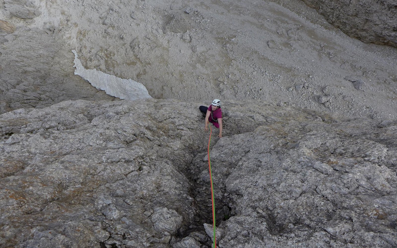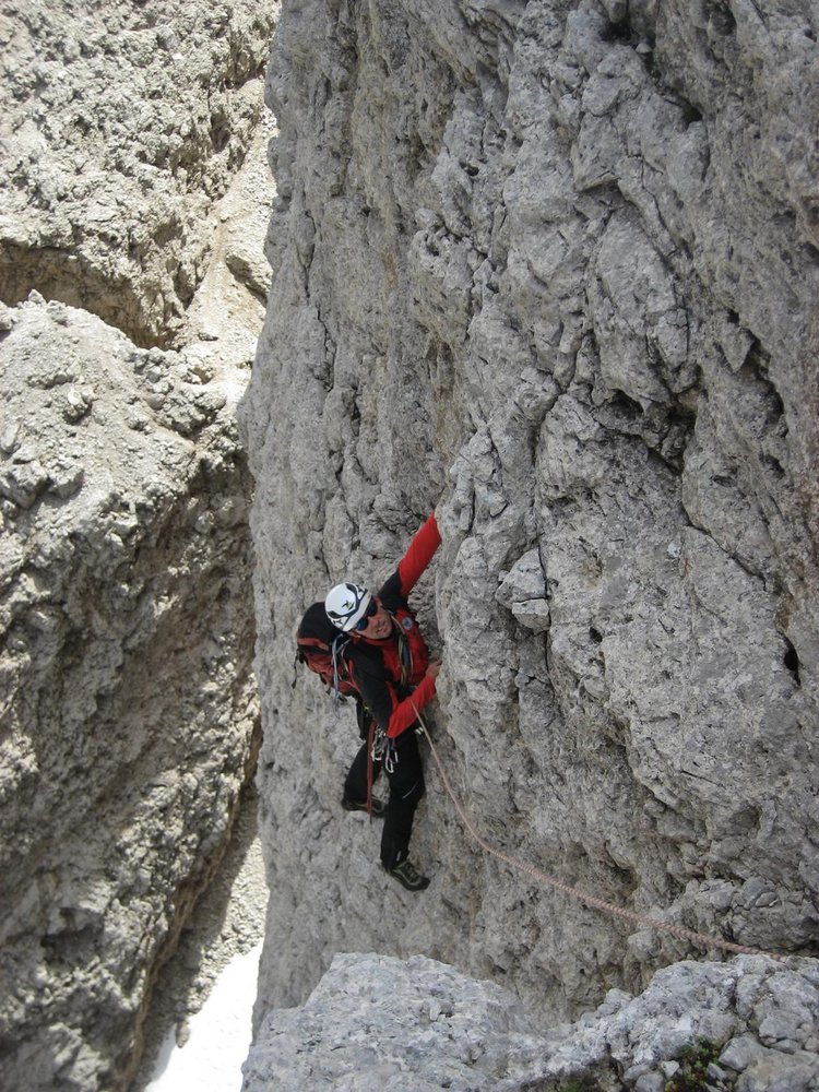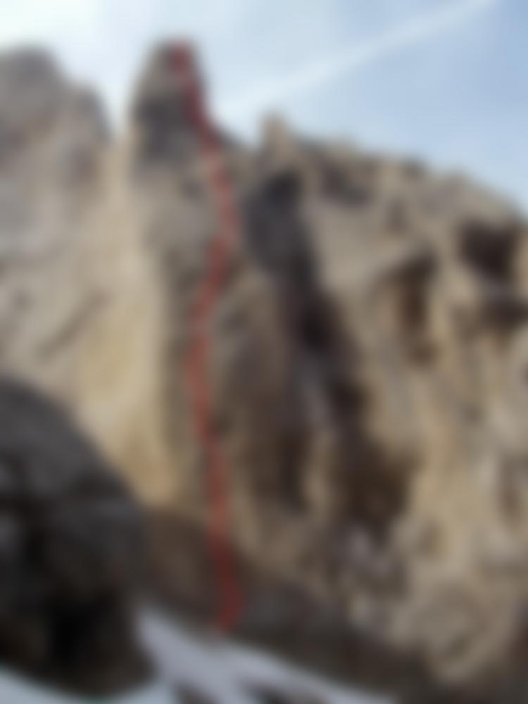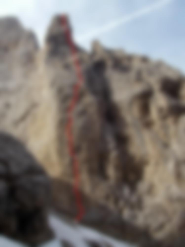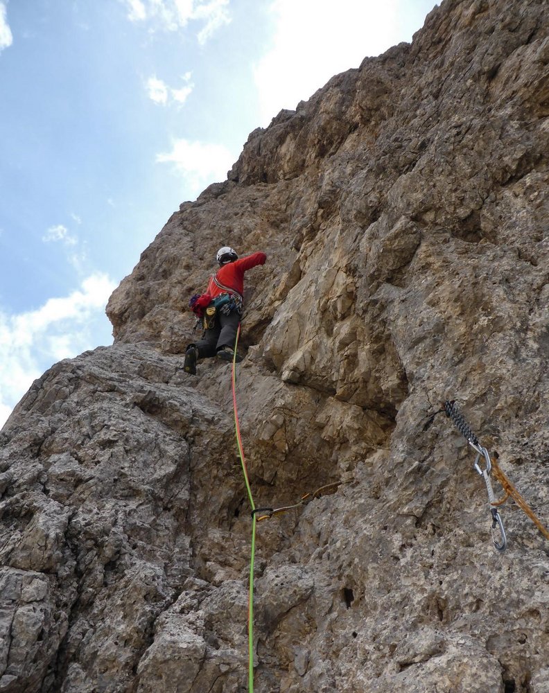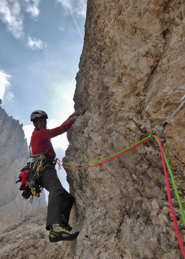 Der Gottesfinger erhebt sich westlich über die Langkofelscharte als deutlich vorspringender Felsturm am Fuße der beliebten »Daumenkante«. Trotz der unmittelbarer Nähe zur Demetzhütte bzw. zur Talstation der Goldelbahn, von wo man die jeweiligen Einstiege überaus komfortabel in wenigen Minuten erreichen kann, werden die Route an dieser kühnen Zinne kaum begangen, zumal sie unter dem Klettervolk noch weitgehen unbekannt sind. Bei der »Astapowo 1910«, mitten durch die schmale Nordwand, handelt es sich um eine anspruchsvolle Kletterei mit eindrücklichen Passagen. Die Hauptschwierigkeiten sind in den ersten drei Seillängen konzentriert und erfordern ein bedächtig-athletisches Steigen an sehr gutem sowie griffigem Fels. Im oberen Teil lassen die Schwierigkeiten nach – aber auch die Qualität des Gesteins, der noch kaum abgeklettert ist. Zu den vorhandenen Haken und den bereits gefädelte Sanduhren wird Eigeninitiative gefordert, zumal die Absicherung teilweise etwas dürftig ausfällt. Trotz der relativ geringen Länge sollte der Anstieg nicht unterschätzt werden.