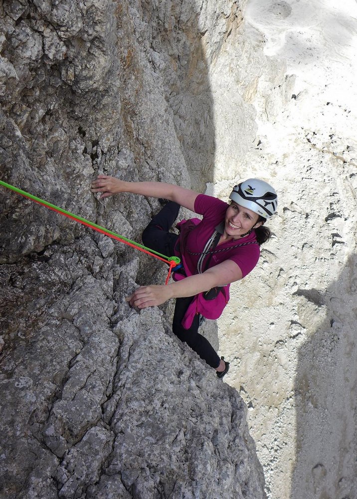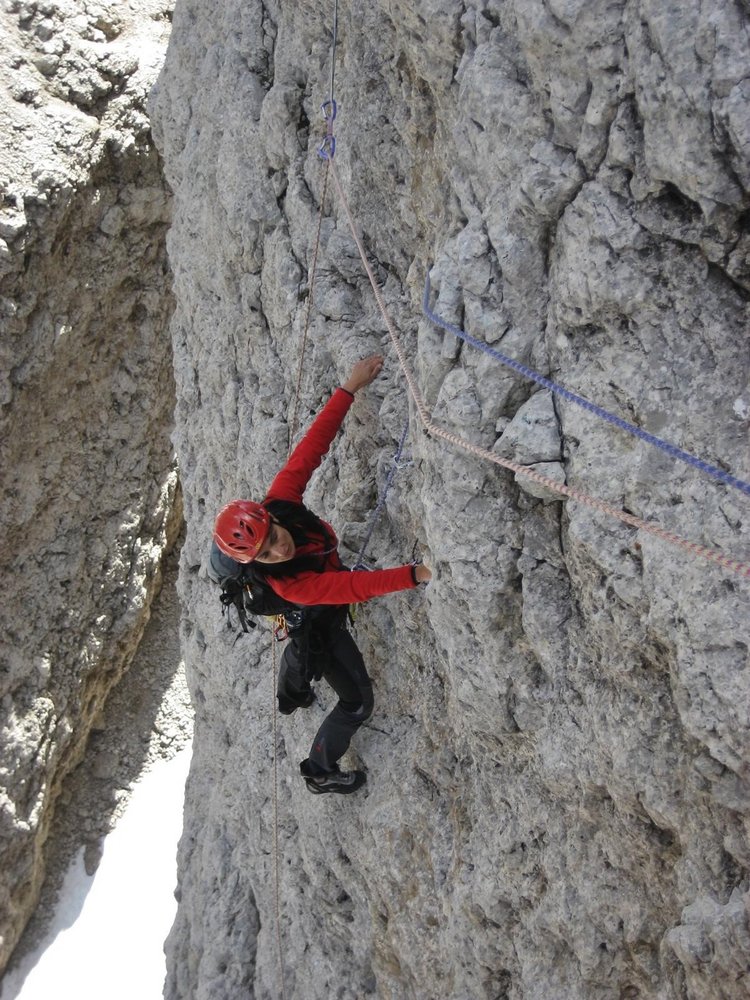 Vom Gipfel über den luftigen Grat etwa 15 m abklettern, zu gebohrtem Ringhaken hinter den Gratturm (III). 1. AS: 20 m abseilen. Nun auf den zerklüfteten Grat in südlicher Richtung, wobei ein Gratturm westseitig über eine brüchige Rampe umgangen wird (II und III). Man erreicht die Scharte am Fuße der »Daumenkante« und steigt ostseitig über eine schräge Rinne und gestufte Felsen hinab zu einer Schuttrampe, die sich zuletzt zu ein schmales Band verengt, zu gebohrtem Ringhaken (II und I). 2. AS: 20 m zu weitem Ringhaken. 3. AS: 10 m zu Wandfuß abseilen. In wenigen Minuten zurück zur Demetzhütte bzw. zur Station der Gondelbahn