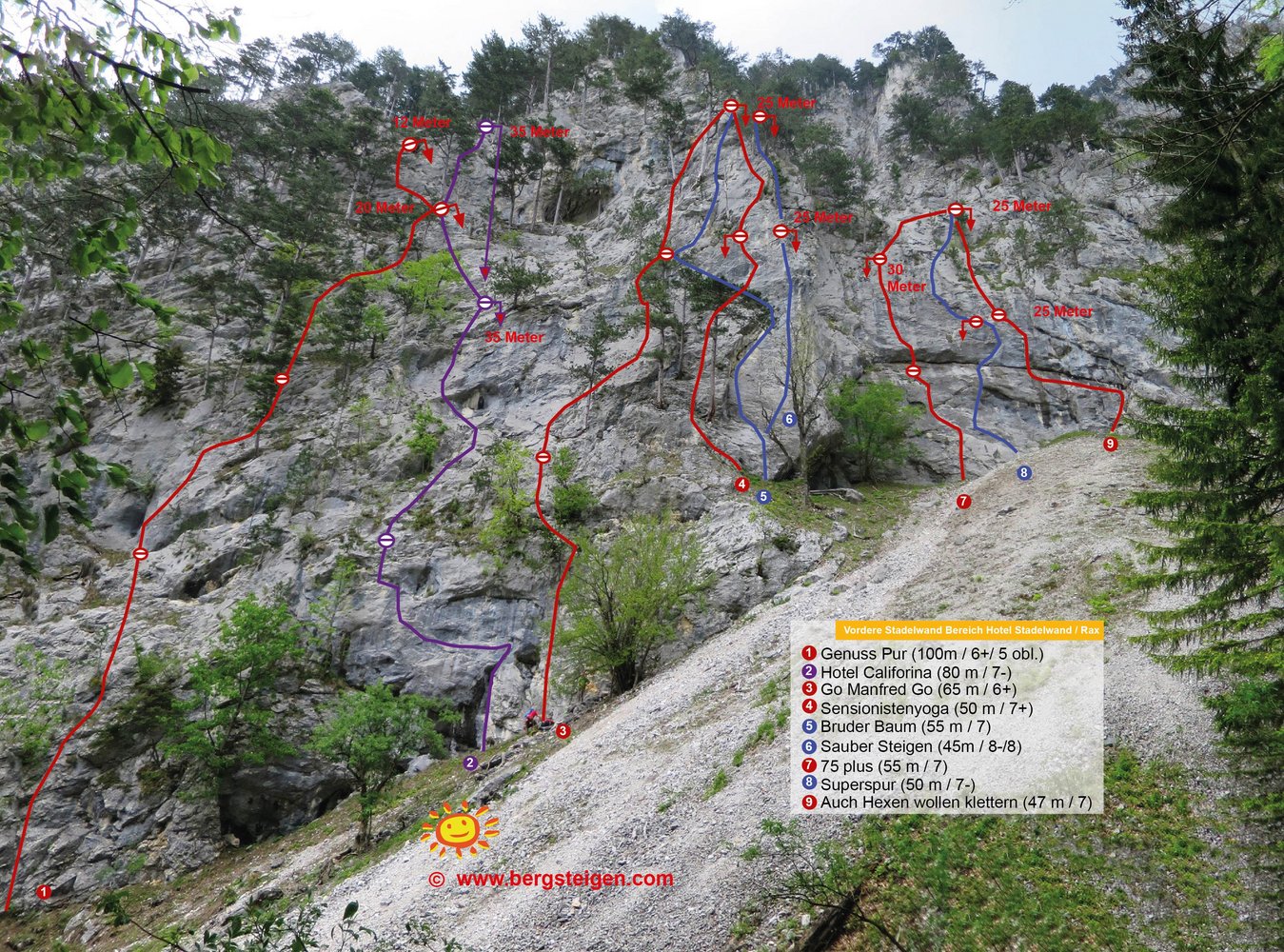 Vom Parkplatz dem Weg in den Stadlwandgraben ca. 25 min folgen, bis man links die Wand sieht. Vom Weg dann links in 2 Min. über Geröll zum Einstieg Hotel Stadelwand hinauf, der Einstieg ist 15 m rechts davon.