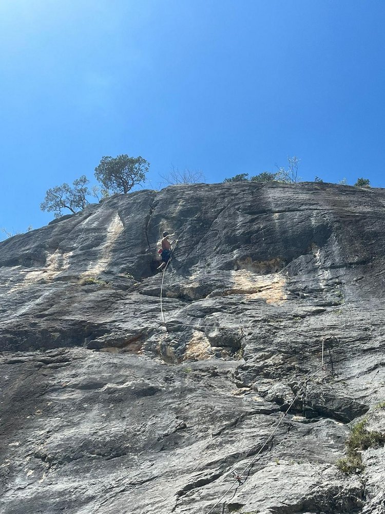 Vollständig geboltete Mehrseillängenroute. Die untersten drei Seillängen sind etwas leichter, dann beginnt die technische Kletterei mit einem schönen Wechsel zu einer Kante mit einer glatten Wand. Die letzte überhängende Seillänge bietet unglaublich ausdauernde und athletische Kletterei an größeren Griffen.