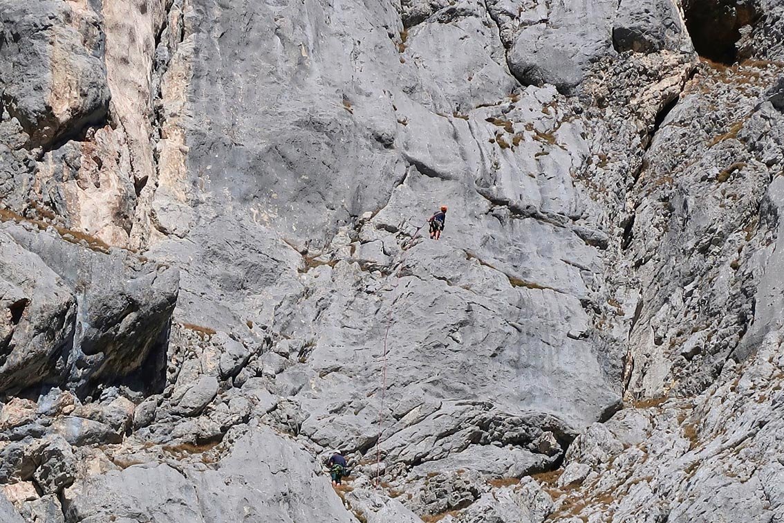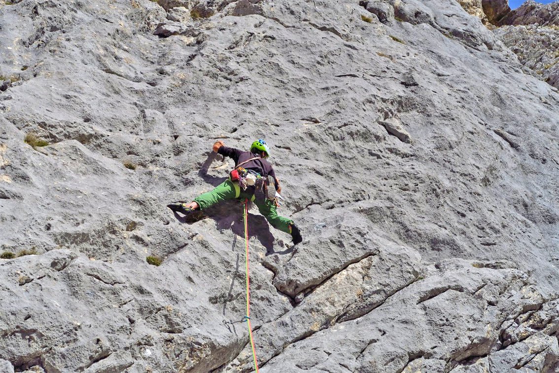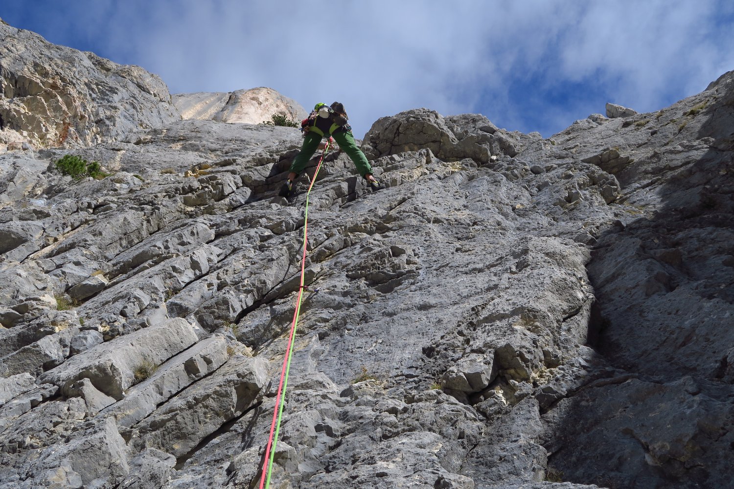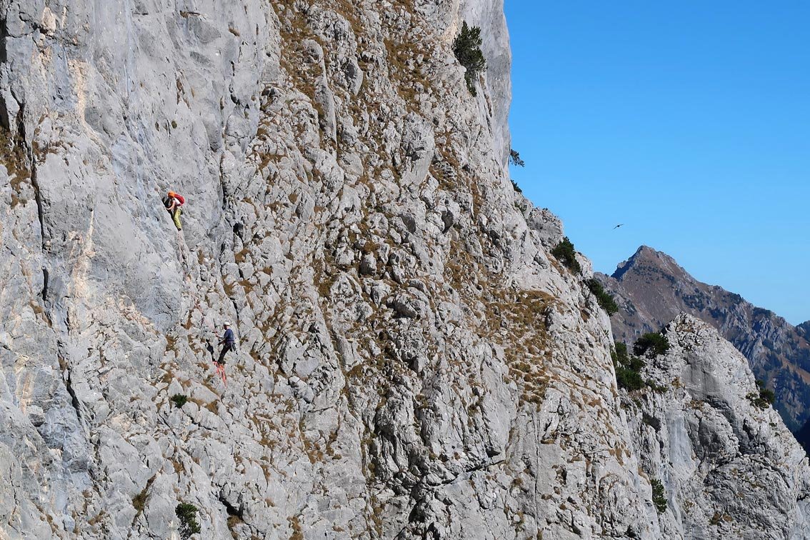 2. SL: Vorsichtig über teilweise etwas unzuverlässigen Fels gerade zwischen zwei Latschen hinauf. Zwei Steilstufen, 5-. Dann über leichtere Rampe (3) rechtshaltend bis unter den Stand. Gerade zu den beiden BH, 4+. (32m, 6 ZH, 5-)