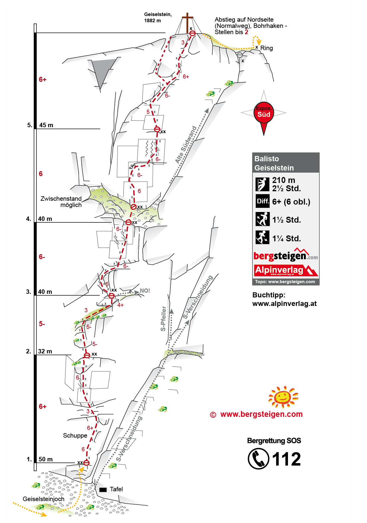 Beliebter Sportkletteranstieg am Geiselstein. Sehr schöne Tour an der Südwand, der Anstieg endet direkt bei dem Gipfelkreuz. Ein hervorragender Fels, außer in der zweiten Seillänge. Obwohl die Tour seit der Sanierung unzählige Male erklettert wurde, gibt es kaum Abnützungserscheinungen. In dem Schwierigkeitsgrad zählt „Balisto“ zu den besten Touren der Region. Die Seillängen sind teilweise lang und nie leicht, die Kletterei ist steil und anspruchsvoll - insgesamt durchaus fordernd!
