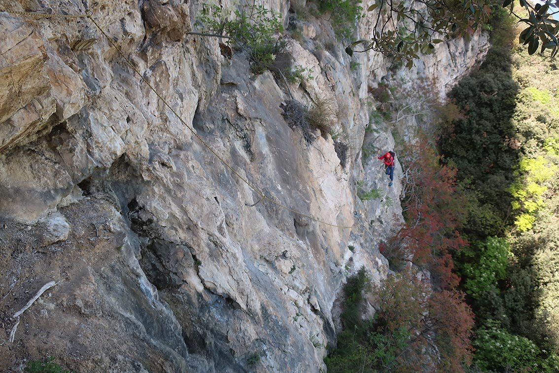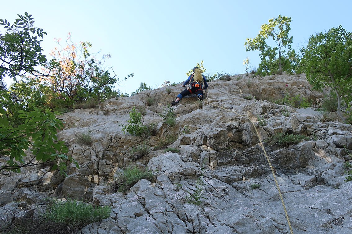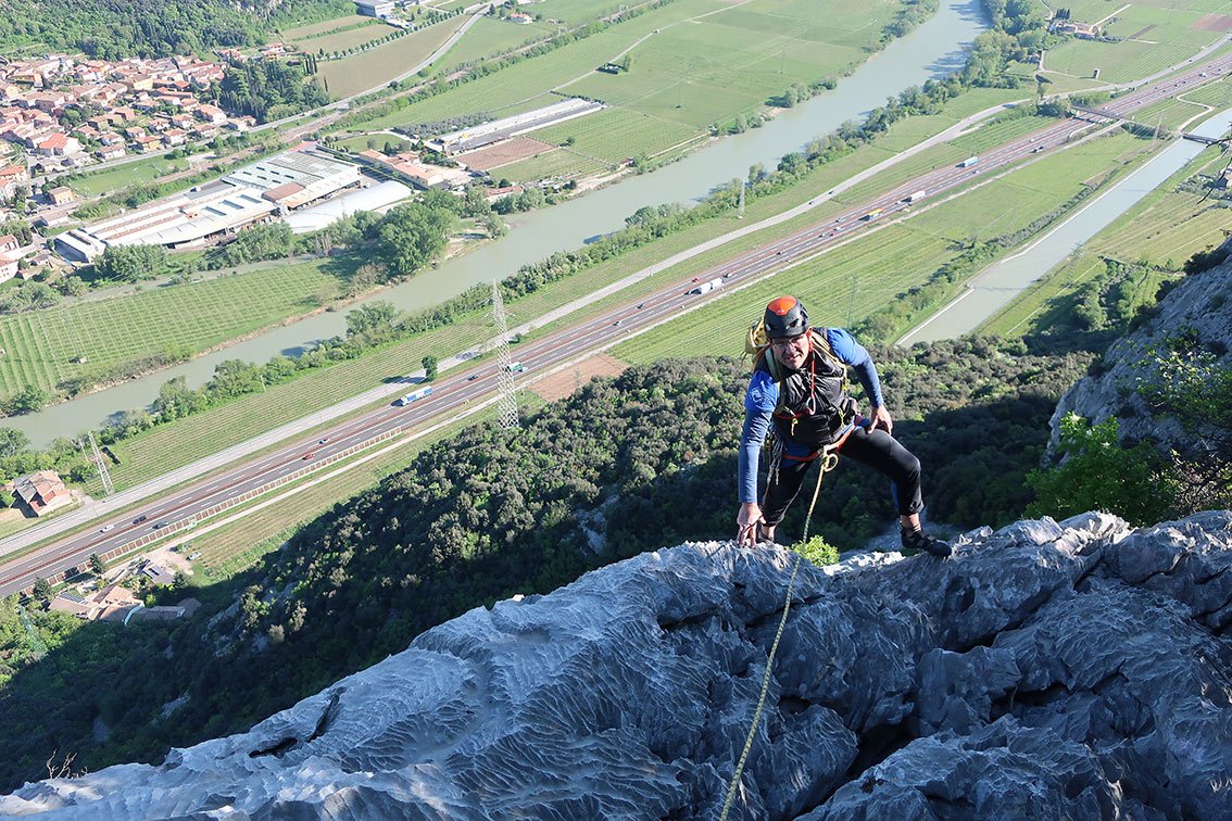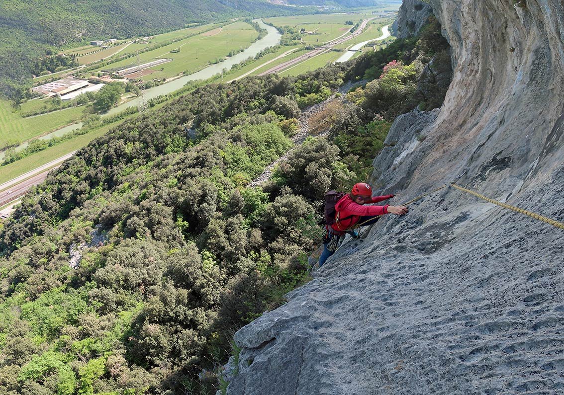 Die Route Ballo sui Buchi ist ein toller Anstieg am rechten Rand der unteren Felsgruppen oberhalb des kleinen Örtchens Tessari. Unten steile, aber sehr griffige Kletterei und zum Abschluss noch einmal der perfekte Tessari-Platten-Lochfels. Zu- und Abstieg sind einfach zu Fuß zu bewältigen und der Ausblick ins Etschtal wird nur minimal durch die Autobahn getrübt. Eine tolle, sehr gut gesicherte Route, um im 6er-Bereich in Tessari Fuß zu fassen!