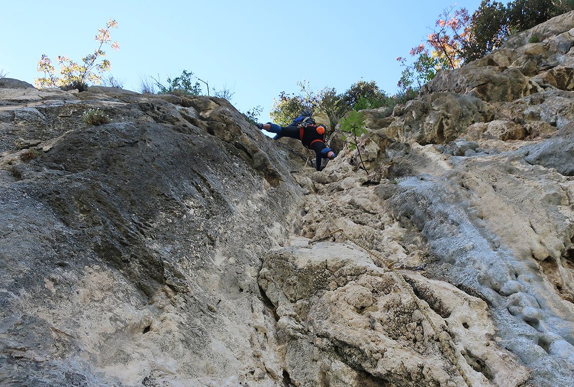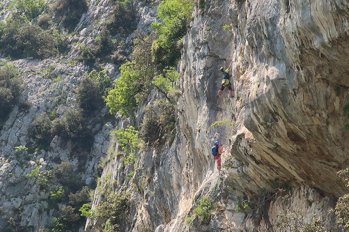 Die Tour ist sehr gut mit Bohrhaken, Normalhaken und Sanduhren abgesichert - in der leichten, mittleren Seillänge etwas weitere Abstände.