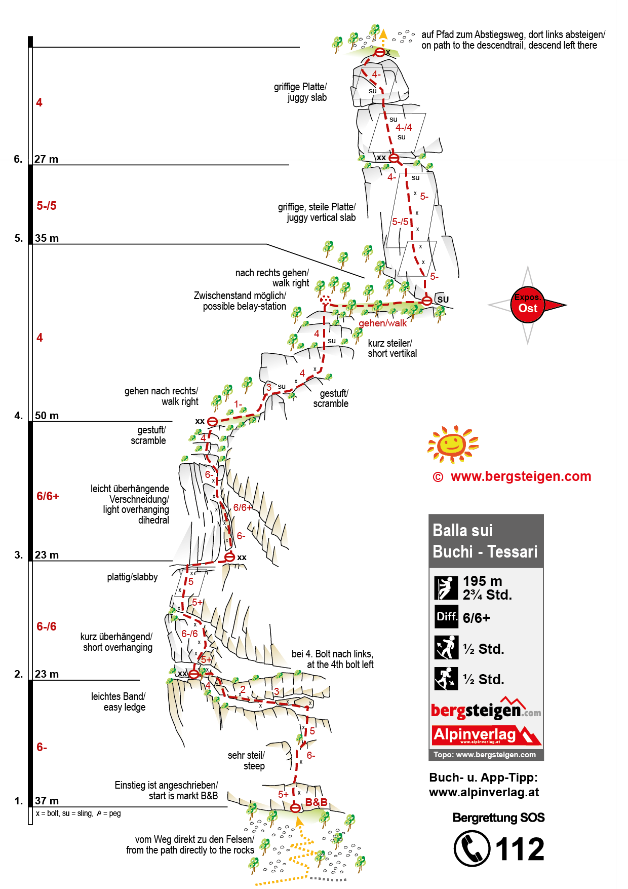 Siehe Topo. Die dritte Seillänge (steile, leicht überhängende Verschneidung mit großen Griffen) ist der Schlüssel zum Erfolg.
