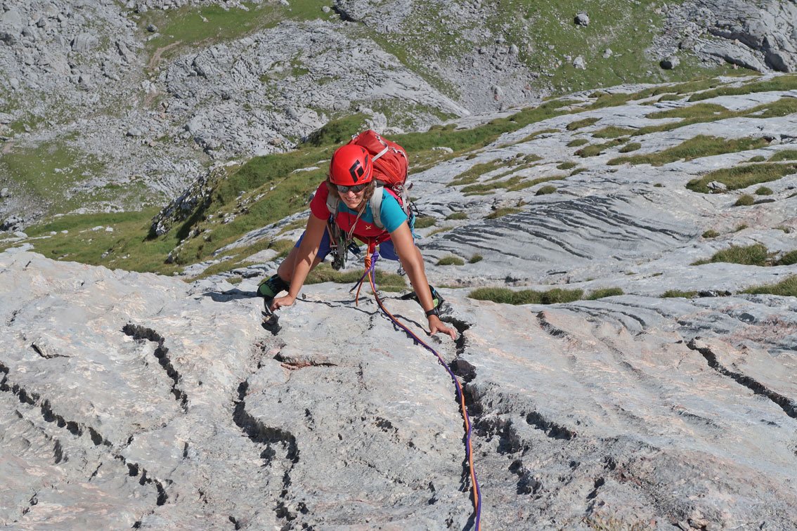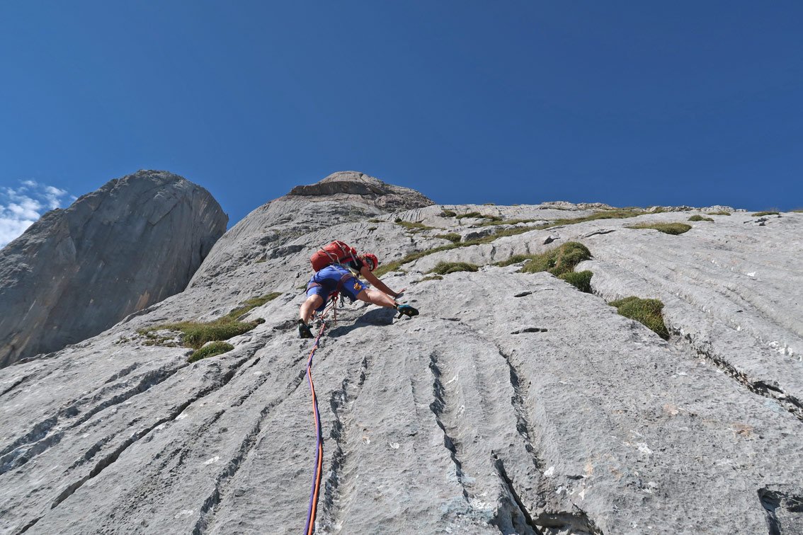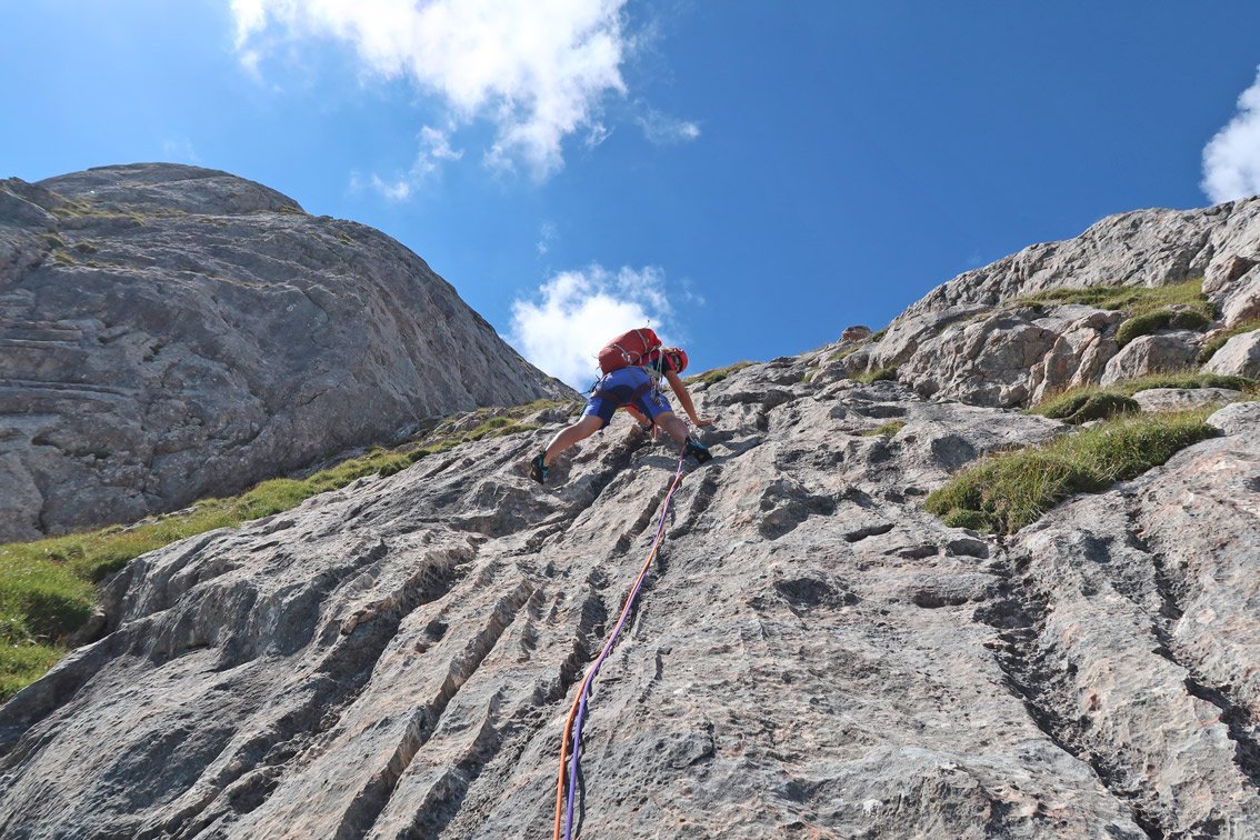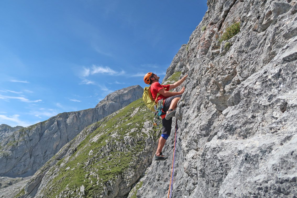 Die Tour ist gut abgesichert, in den leichten Seillängen muss man aber teilweise schon weiter bis zum nächsten Bohrhaken klettern.