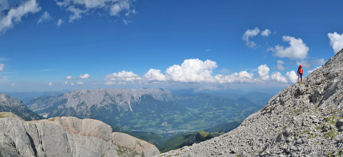 Leichte Tour an der Östlichen Schoberplatte - die Kletterei ist leider etwas inhomogen. Unten sind 2 schwere Seillängen, dann wird die Tour leicht (4) und läuft dann oben in ganz leichten Schrofenplatten aus. Für Einstieger, die die ersten zwei Seillängen schaffen eine gute und vor allem lange Genusstour mit einer luftigen Abseilfahrt beim Abstieg.