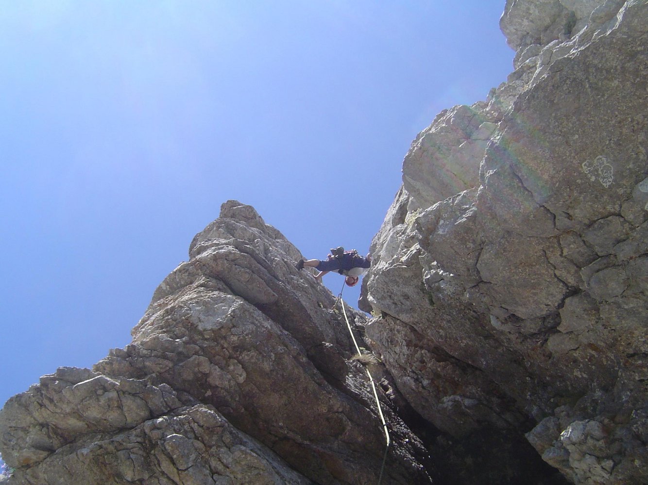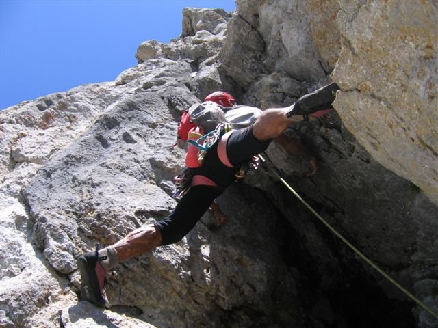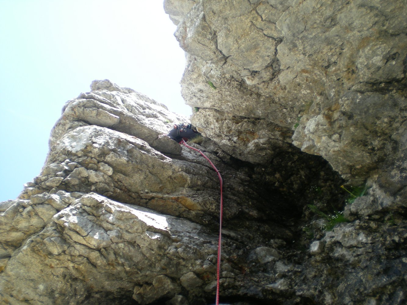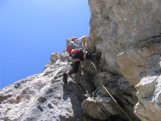 Wirklich nette Risskletterei die zu Unrecht seltener begangen wird als der Kowelkapfeiler. Die Linie fuehrt links vom Kowelkapfeiler durch ein Riss- und Verschneidungssystem und ist neuerdings auch mit Bohrhaken saniert (dass heißt nicht klettergartenmaessig, sondern der Umgebung entsprechend, also alpin abgesichert). Nach Regentagen laenger nass, aber man kann ja dann zu den neuen Baseclimbs am Wandfuss, links vom Einstieg, ausweichen und ist nicht umsonst hinauf gegangen.