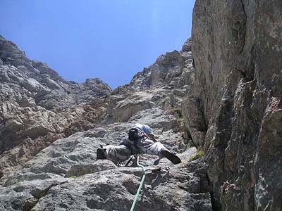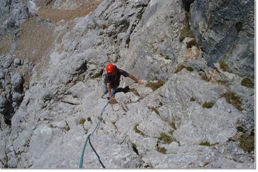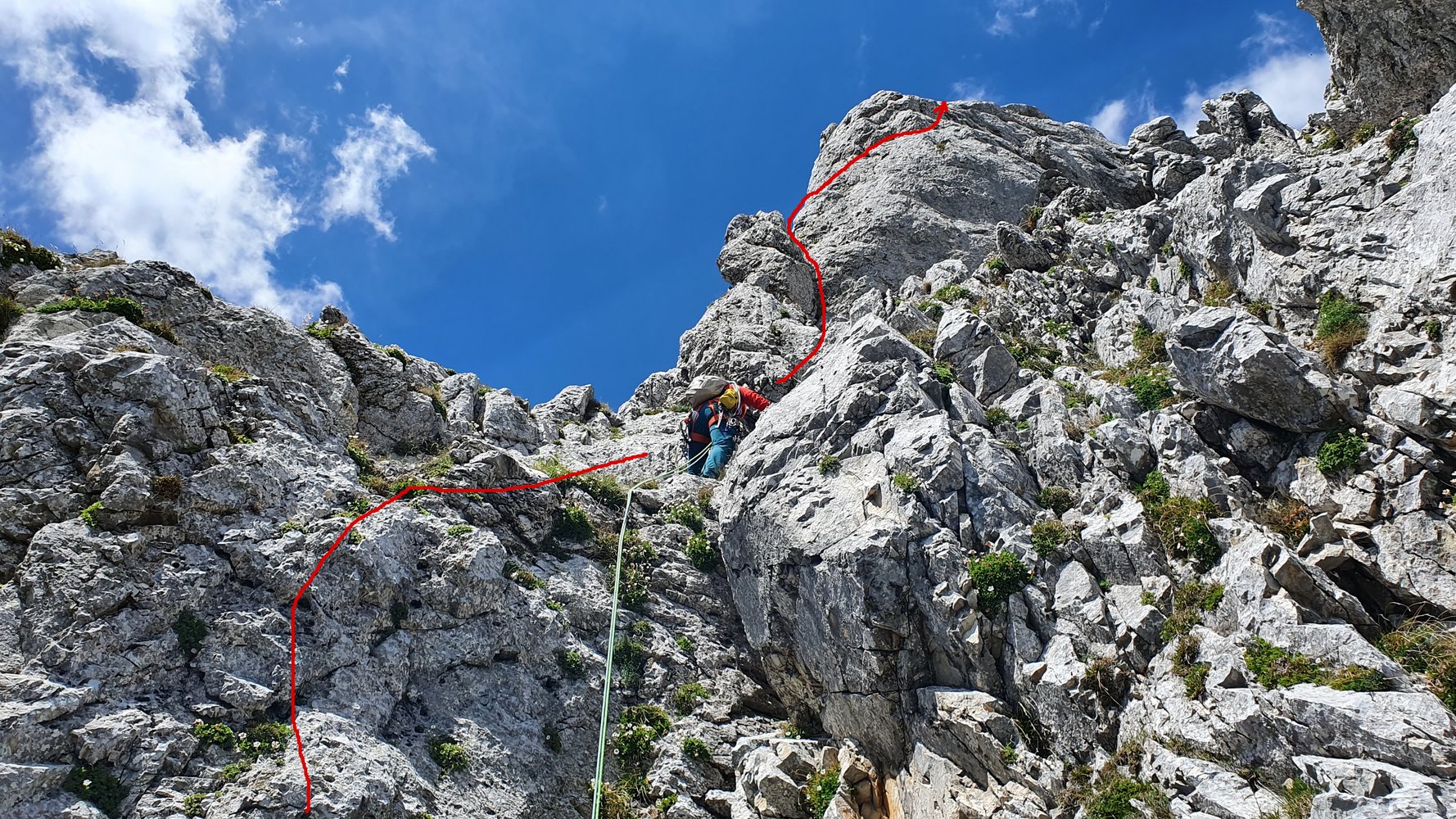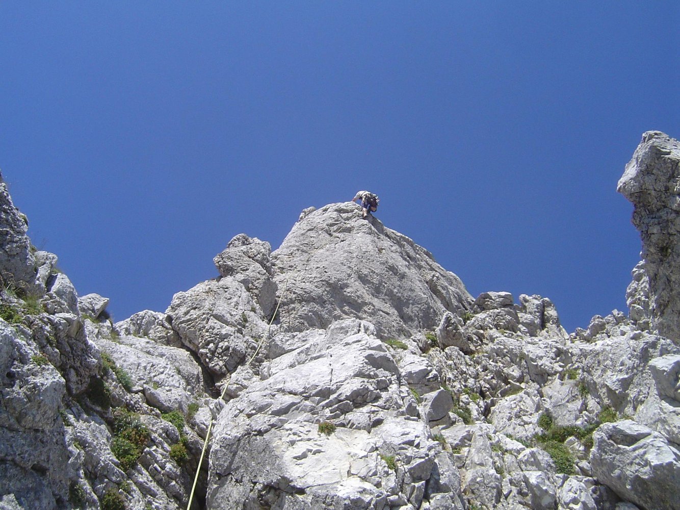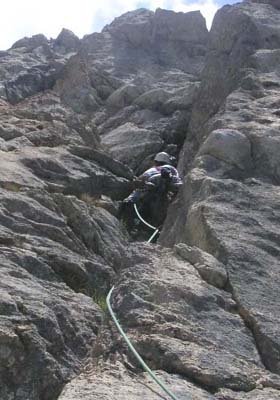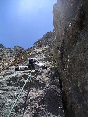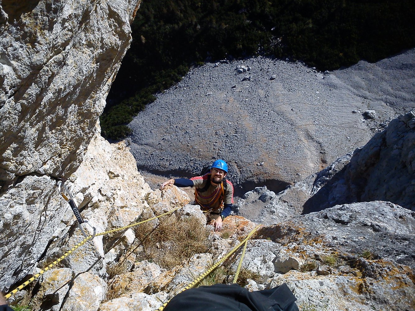 Wirklich nette Risskletterei die zu Unrecht seltener begangen wird als der Kowelkapfeiler. Die Linie fuehrt links vom Kowelkapfeiler durch ein Riss- und Verschneidungssystem und ist neuerdings auch mit Bohrhaken saniert (dass heißt nicht klettergartenmaessig, sondern der Umgebung entsprechend, also alpin abgesichert). Nach Regentagen laenger nass, aber man kann ja dann zu den neuen Baseclimbs am Wandfuss, links vom Einstieg, ausweichen und ist nicht umsonst hinauf gegangen.