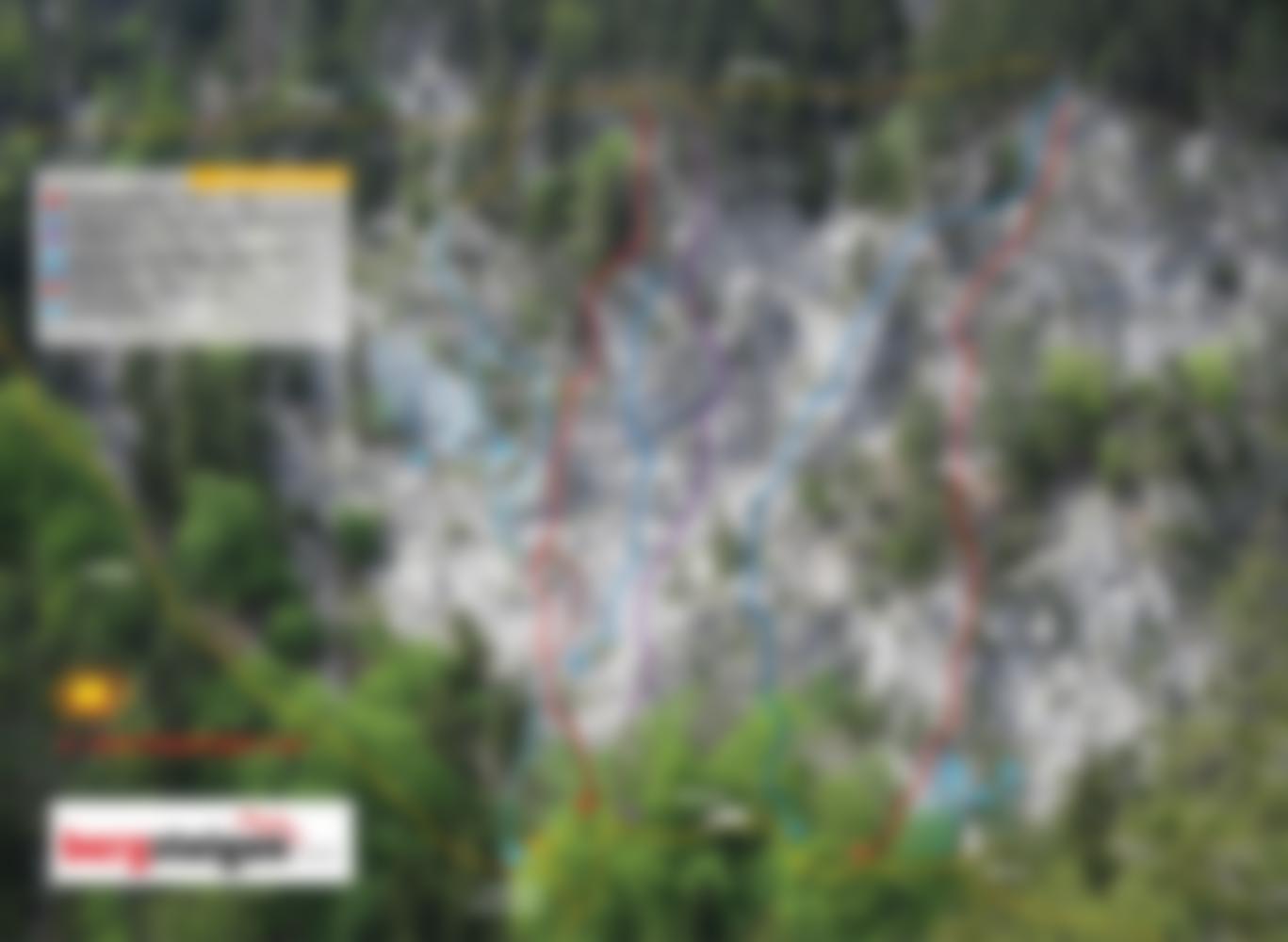 Mehrere Touren. Von 2+ bis 8- ist alles vertreten, genaue Infos am Topo rechts!