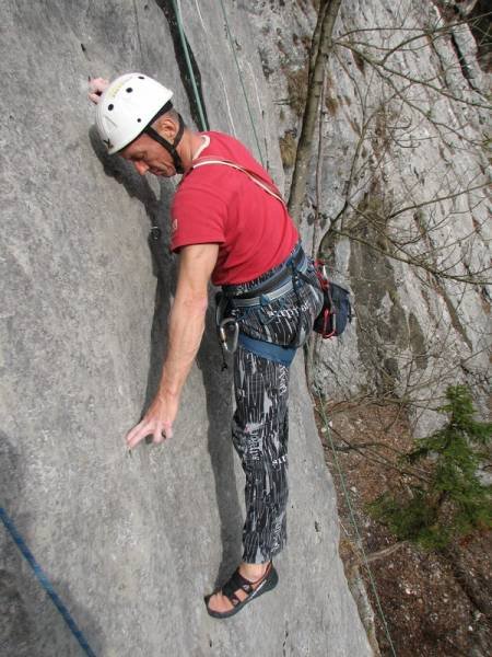 Dem Meister Thomas Behm ist es zu verdanken, dass es nun auch Sportkettereien in der Vorderen Stadelwand gibt. Die Routen sind maximal 25 m lang und es kann oben umgelenkt werden. Meist Plattenkletterei, aber es gibt auch ein paar kraeftige Ueberhaenge. Die zwei Touren rechts sind zwar nicht so schoen aber fuer Anfaenger geeignet. Ach ja, den Helm nicht vergessen, der Steinschlag ist in diesem Wandbereich sehr gross. Auch wenn keine Seilschaften unterwegs sind, die Gemsen werfen auch Steine hinunter. (Den Helm gleich aufsetzen und nicht im Rucksack lassen!)