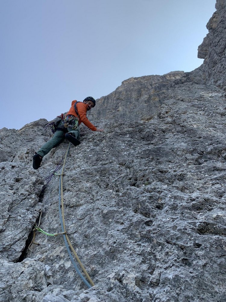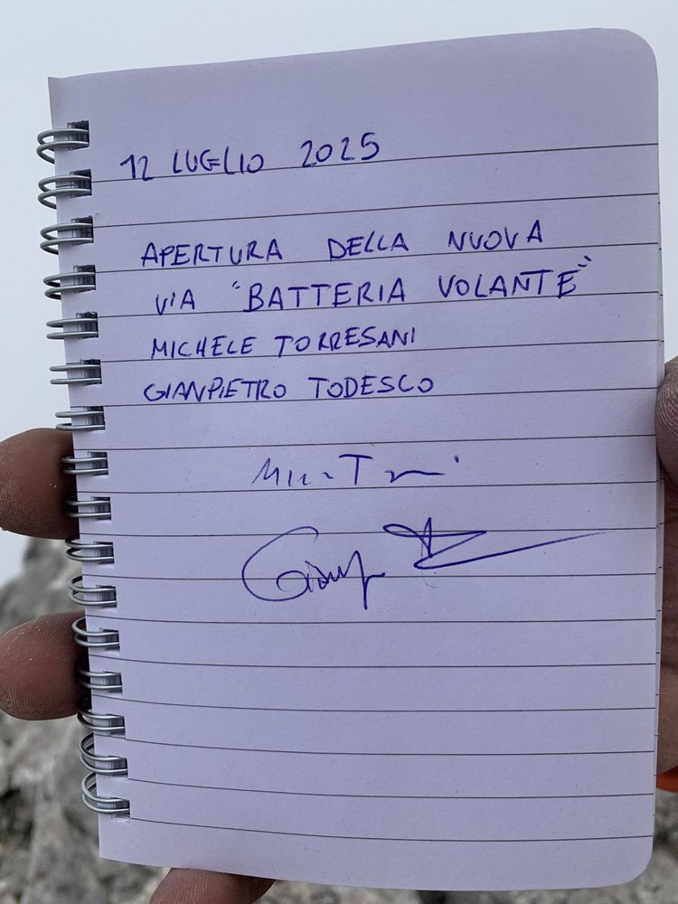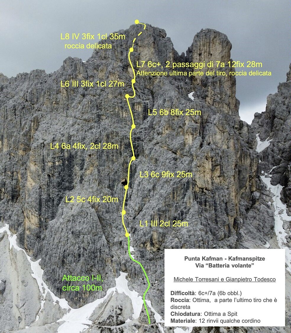 „Batteria Volante“ ist eine lohnende Route – ideal für Kletter:innen, die kurze Zustiege schätzen oder bei unsicherem Wetter eine verlässliche Tour suchen, sie ist eine durchgehende, elegante Linie im mittleren Schwierigkeitsgrad – gut abgesichert an den Schlüsselstellen, mit leichteren Passagen dazwischen. Acht Seillängen, maximal 7a, durchgehend solider Fels – einzig die letzte Länge führt durch einen etwas brüchigen Kamin.