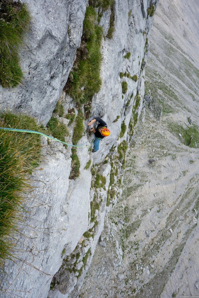 Ein Klassiker an der Schüsselkarspitze Südwand. Guter Fels und abwechslungsreiche Kletterei mit dem Höhepunkt in Form eines Piazrisses, den man selbst absichern muss.