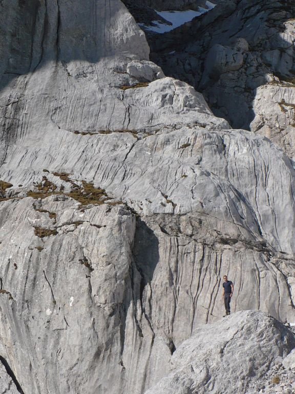 Durch ein Geröllkar nach der Waldgrenze hinauf. Der Weg verliert sich kurz auf einer Wiese unter der Stangenwand, man geht in der ursprünglichen Richtung leicht linkshaltend weiter, nach ca. 10 min "taucht" der Weg im Geröll wieder auf. Die Ostkante ist dann gut sichtbar, man steigt erst auf fast gleicher Höhe links zum Einstieg hinüber (mühsam im Geröll, aber bei genauerem Hinsehen sind Wegspuren zu erkennen).