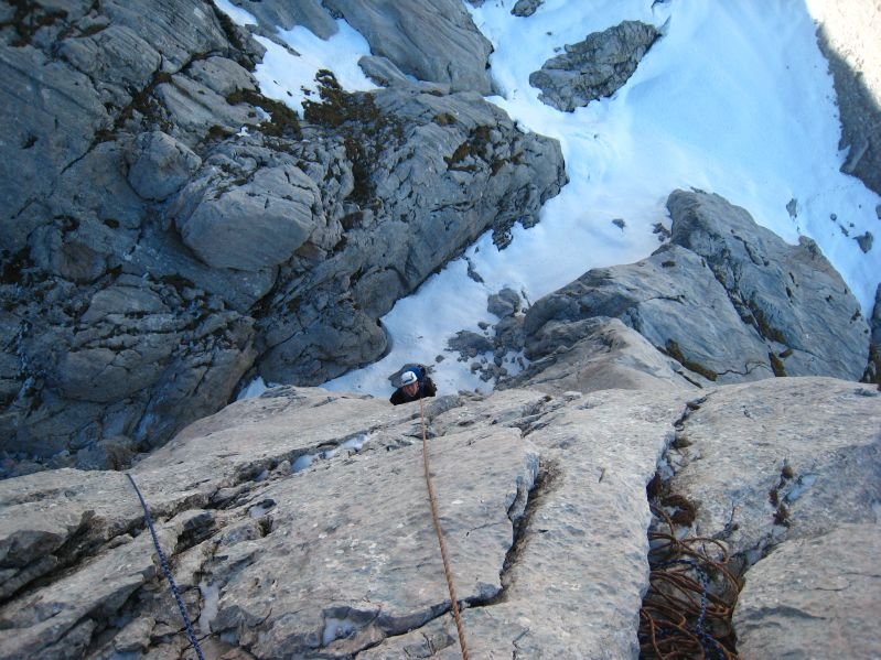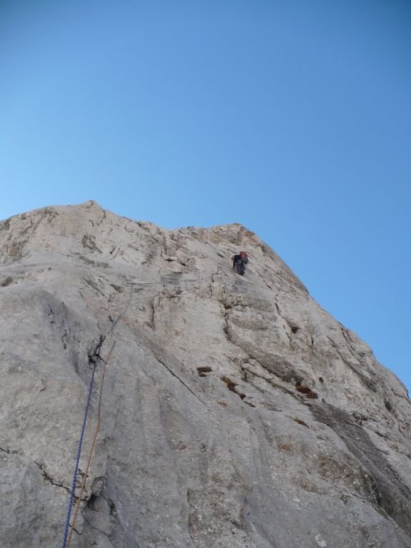 In der 2. SL gibt es nun 4 Haken, der 2. Stand ist eher links, er wird in einer rechts - links - Schleife erreicht. Nach dem letzten NH NICHT nach rechts zu NH-Stand mit Schlinge!