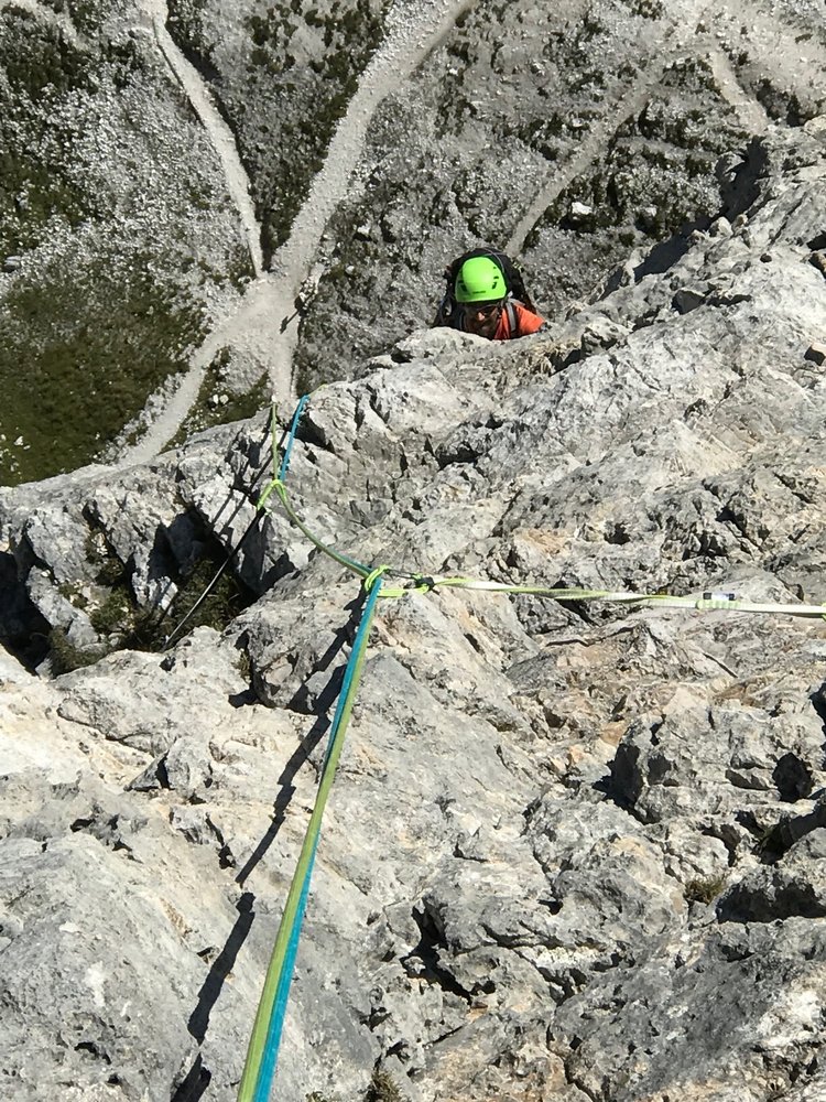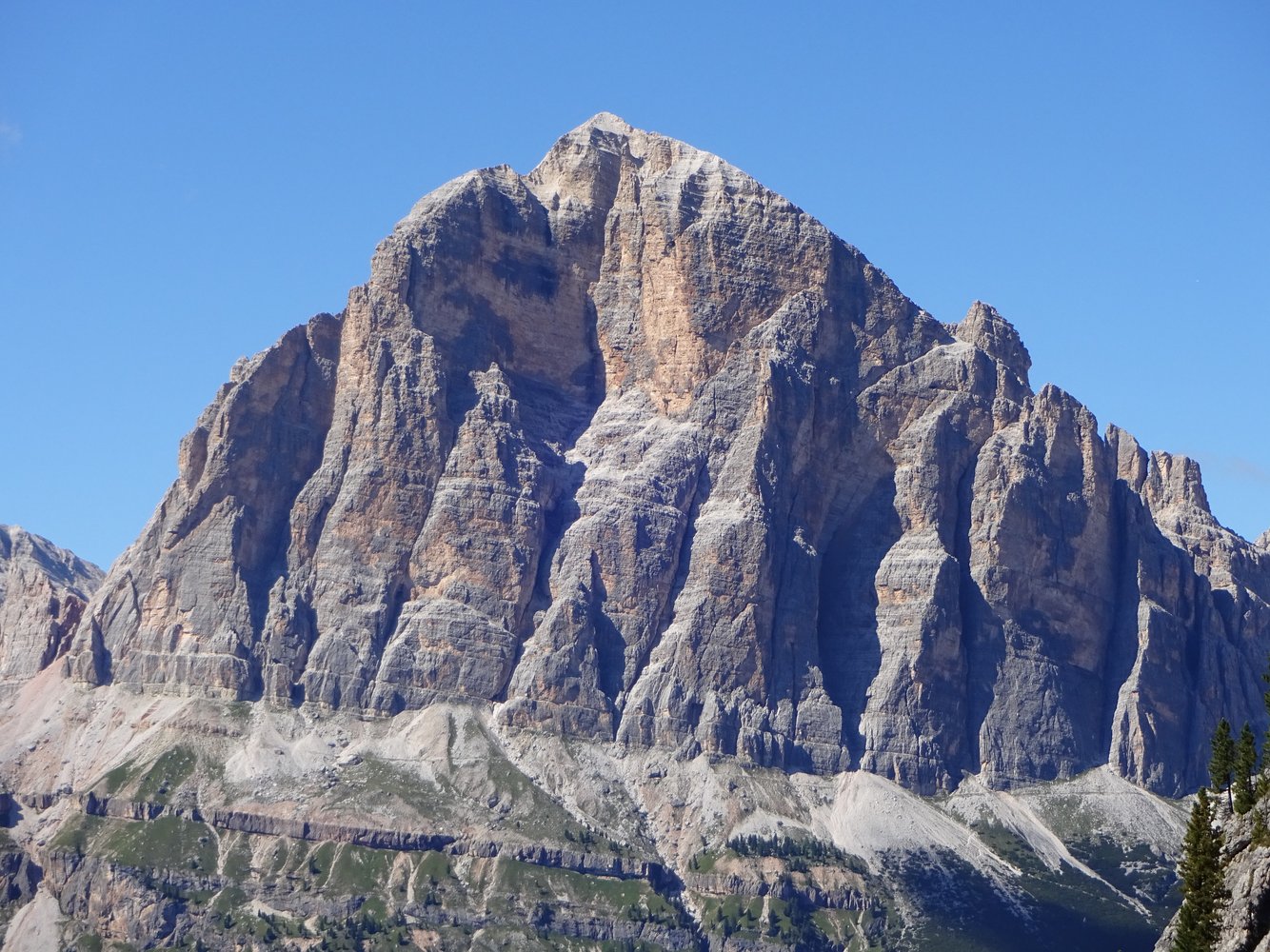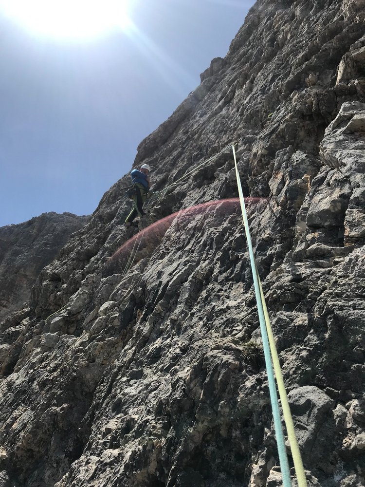 Der 3. Tofanapfeiler ist durch zwei große Bänder unterbrochen. Über diese kann man, wenn es einmal nicht so gut läuft, problemlos in den leicheteren Klassiker ausweichen.
