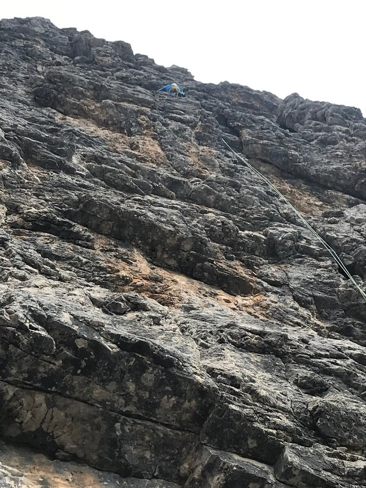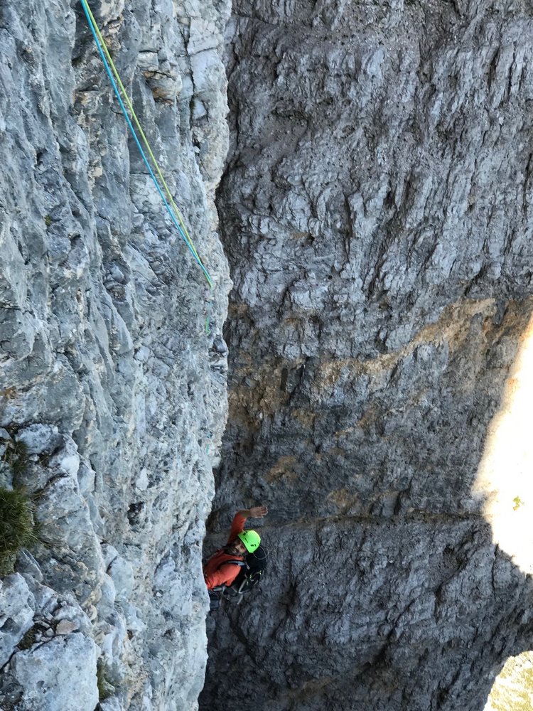 Mit Ausnahme der 4.Seilläge, welche anhaltend schwer ist, beschränken sich die schwierigen Bereiche eher auf kürzere Passagen.