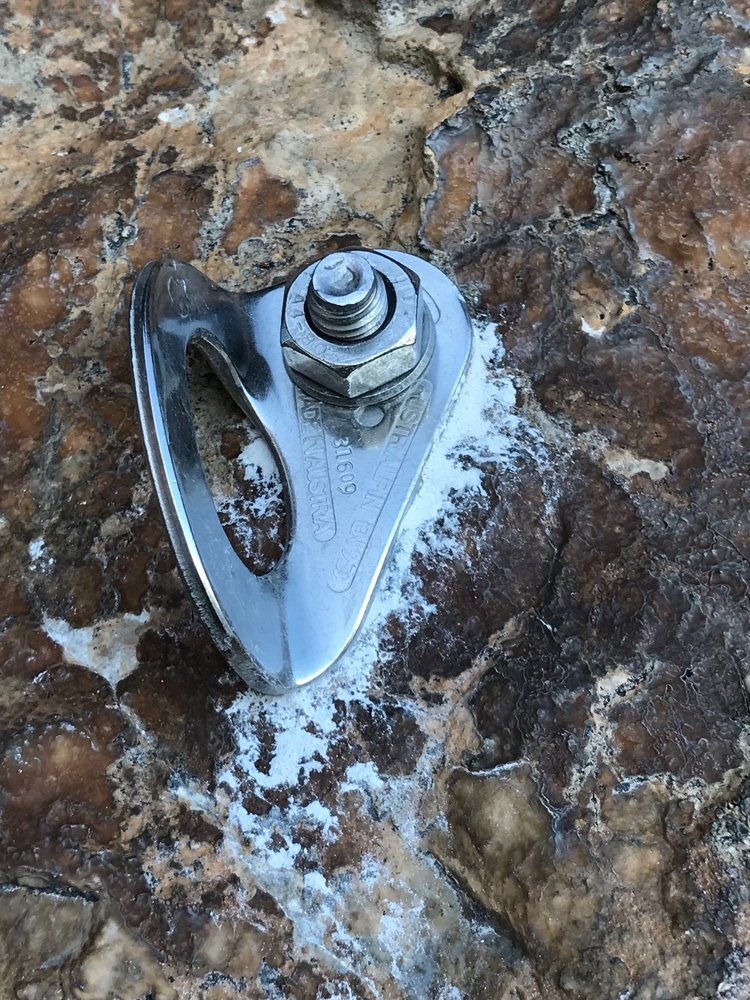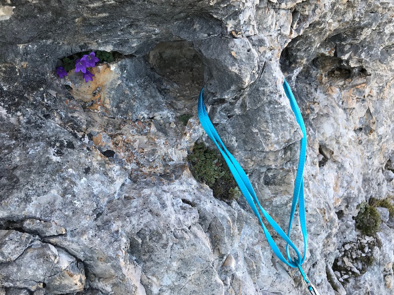 Alle schweren Stellen sind mit Bohrhaken gesichert. Dazwischen sind Camelots als Ergänzung sehr sinnvoll. Insgesamt lässt sich die Tour gut absicherern! Im leichteren Gelände haben die Bohrhaken größere Abstände, hier ist Eigeninitiative gefordert!