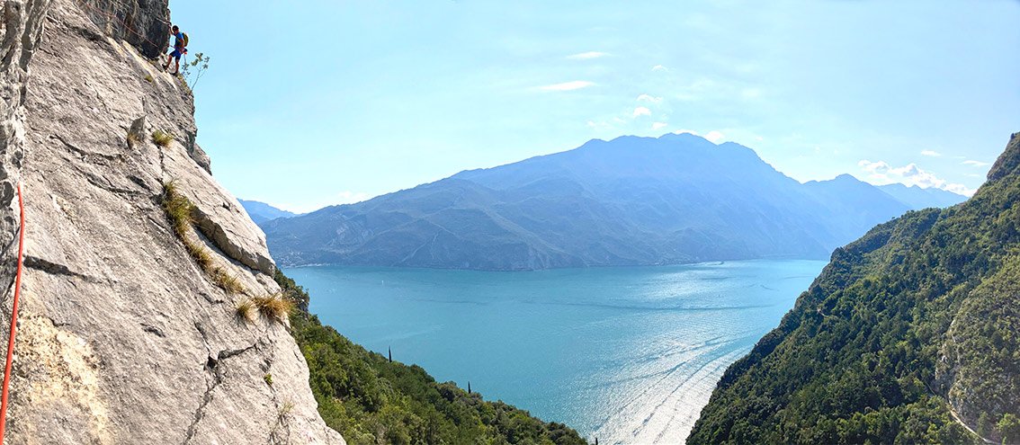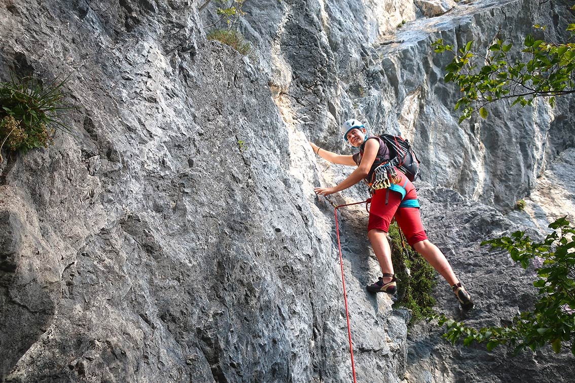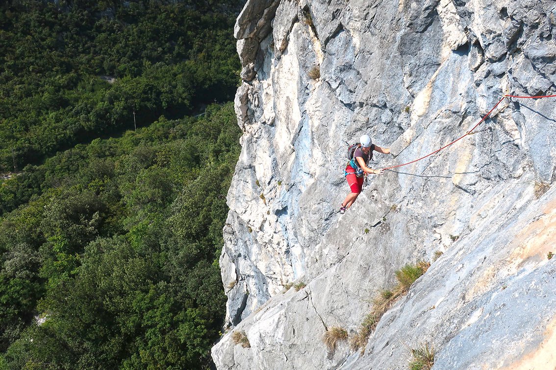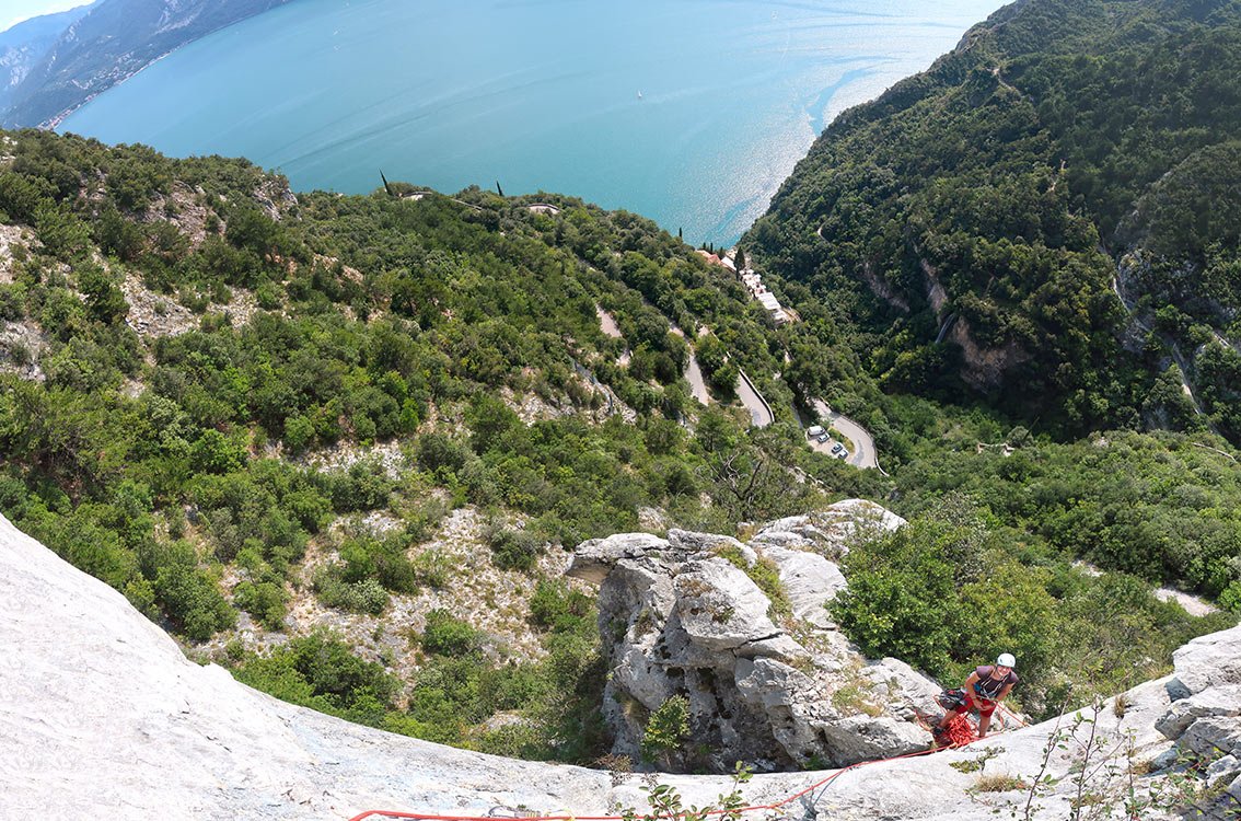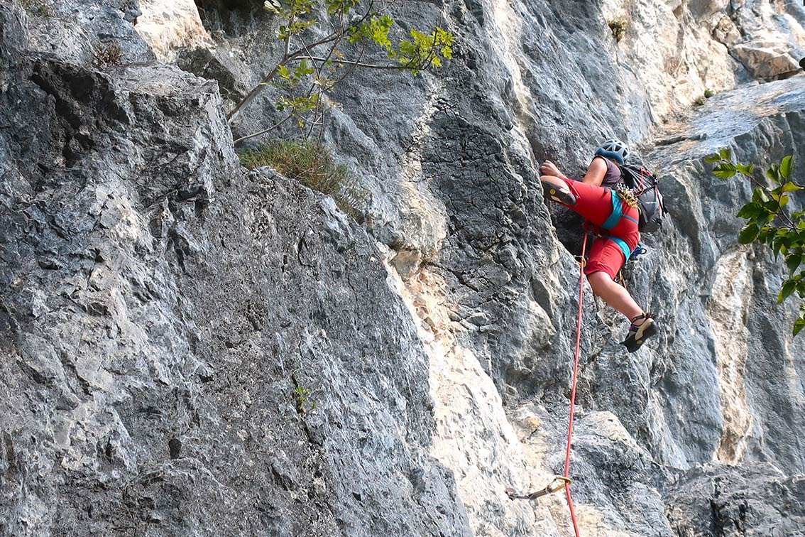 Die tolle Plaisirroute Bella e Cattiva ist ganz rechts an der unteren Mehrseillängenwand im Val di Ledro und fast auf dem Niveau der "Primavera"! Man klettert anfangs an einer schönen Rampe, ausgesetzt und mit perfektem Blick auf den Gardasee, weiter oben wird die Kletterei dann steiler. Wirklich guter, sehr gut abgesicherter Anstieg, bei dem man die kurze 7er-Stelle auch einfach technisch klettern kann.