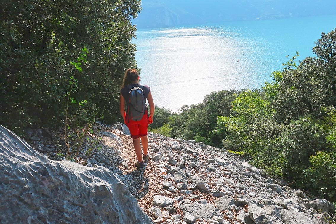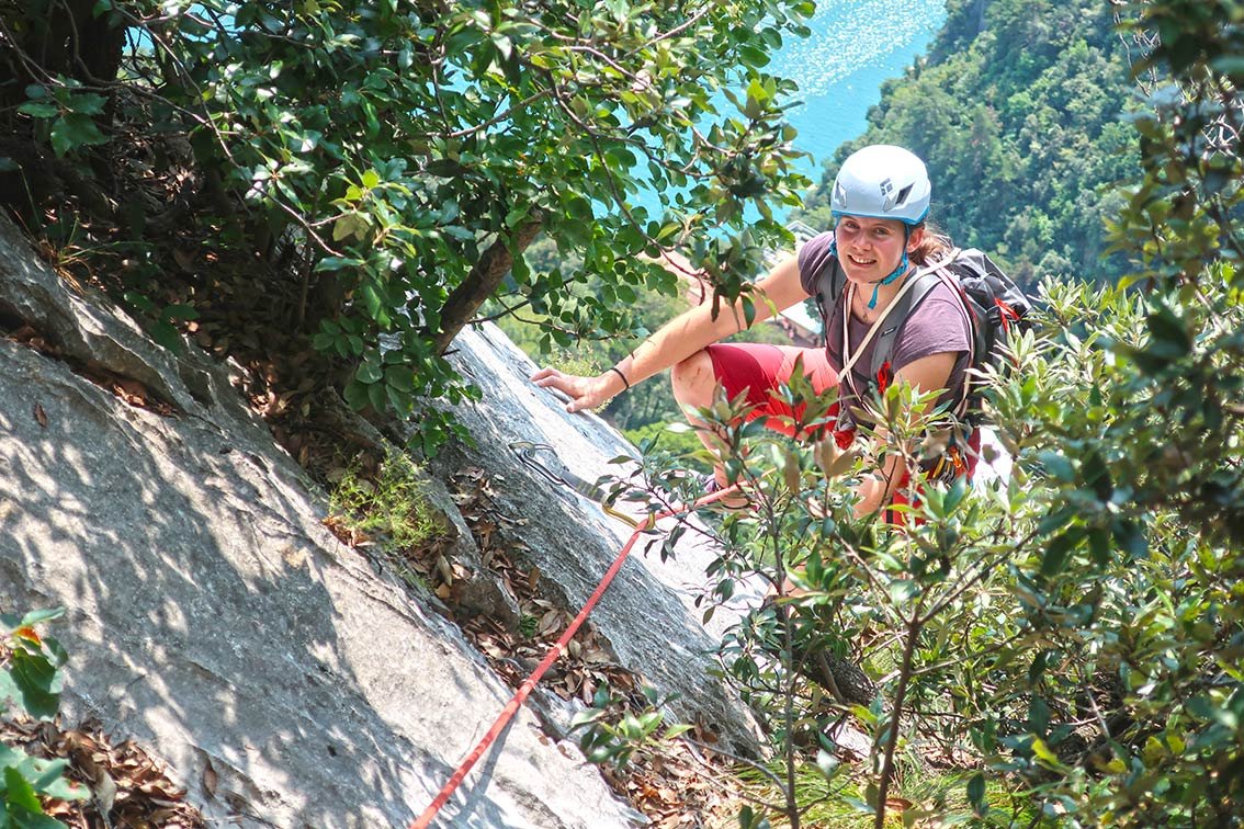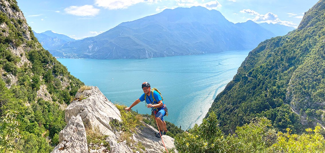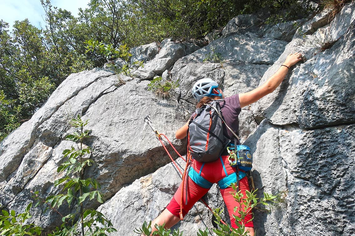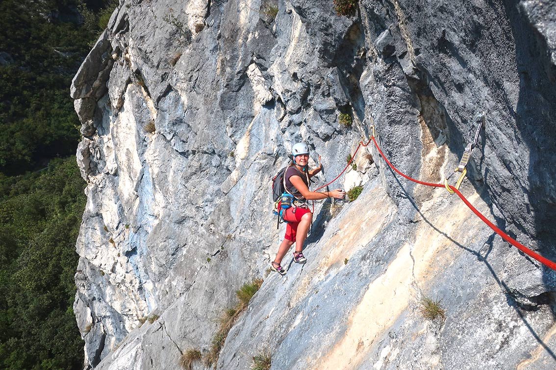 Die tolle Plaisirroute Bella e Cattiva ist ganz rechts an der unteren Mehrseillängenwand im Val di Ledro und fast auf dem Niveau der "Primavera"! Man klettert anfangs an einer schönen Rampe, ausgesetzt und mit perfektem Blick auf den Gardasee, weiter oben wird die Kletterei dann steiler. Wirklich guter, sehr gut abgesicherter Anstieg, bei dem man die kurze 7er-Stelle auch einfach technisch klettern kann.