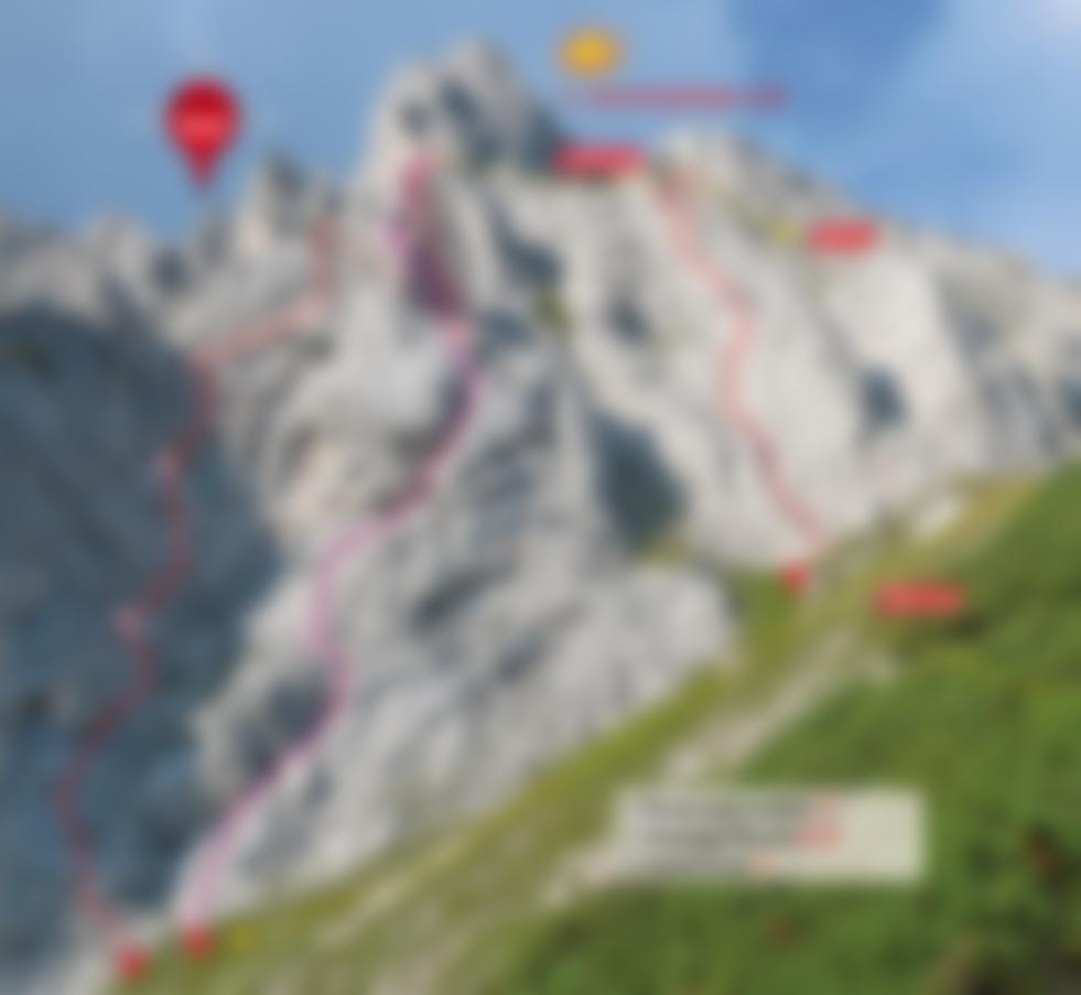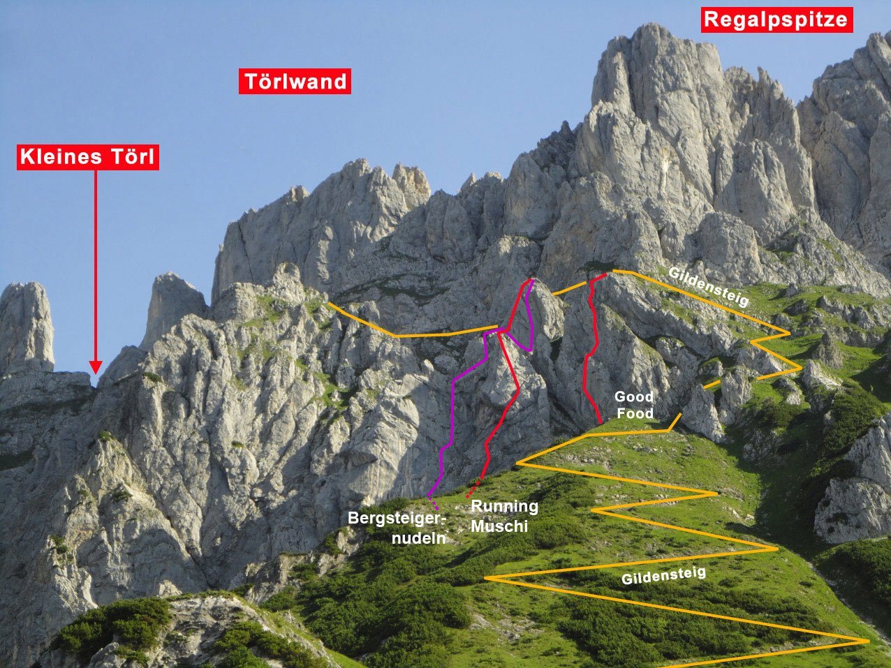 Vom Ende der Tour vom Felsturm hinüber zum schon sichtbaren Gildensteig und auf diesem rechts hinunter zum Wandfuß. Dann auf dem Zustiegsweg zurück ins Tal.