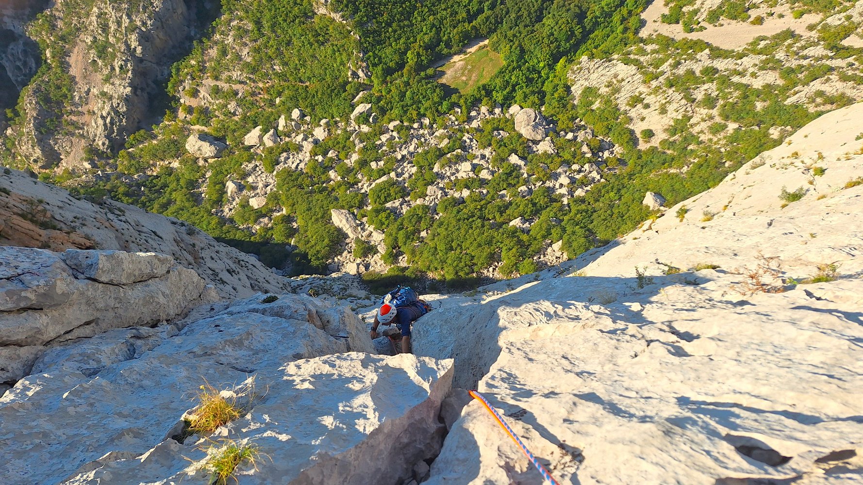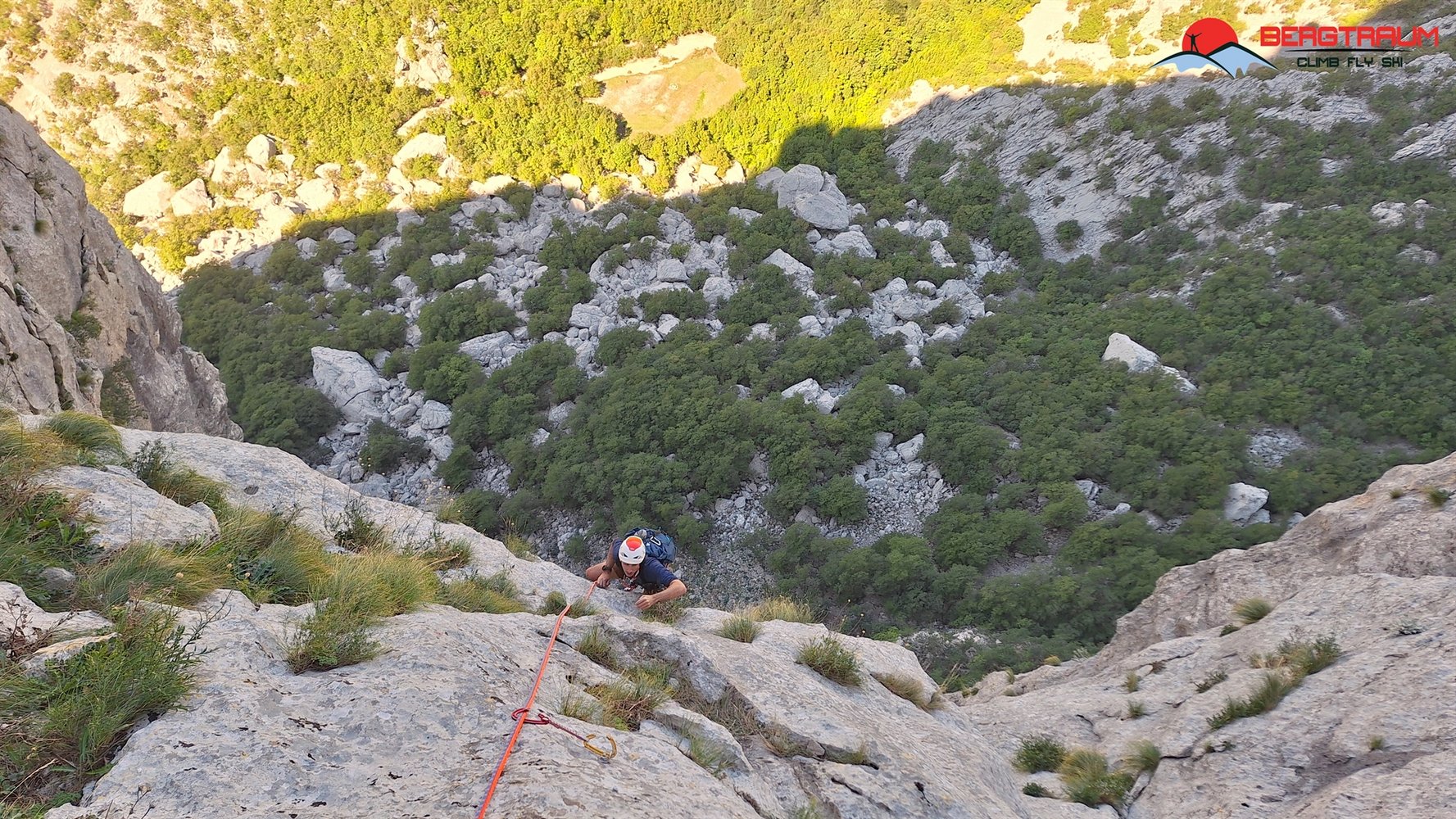 Die Route ist mit Bohrhaken sehr gut gesichert und alle Stände sind gebohrt. Die Abstände sind aber auch hier, wie überall in Paklenica weiter. Ein mittleres Sortiment an Klemmkeilen und Friends ist nützlich.