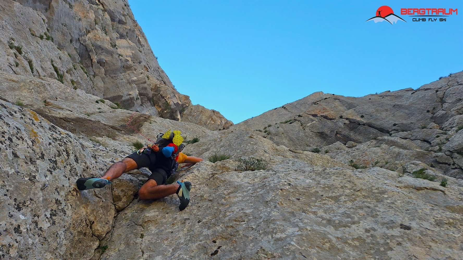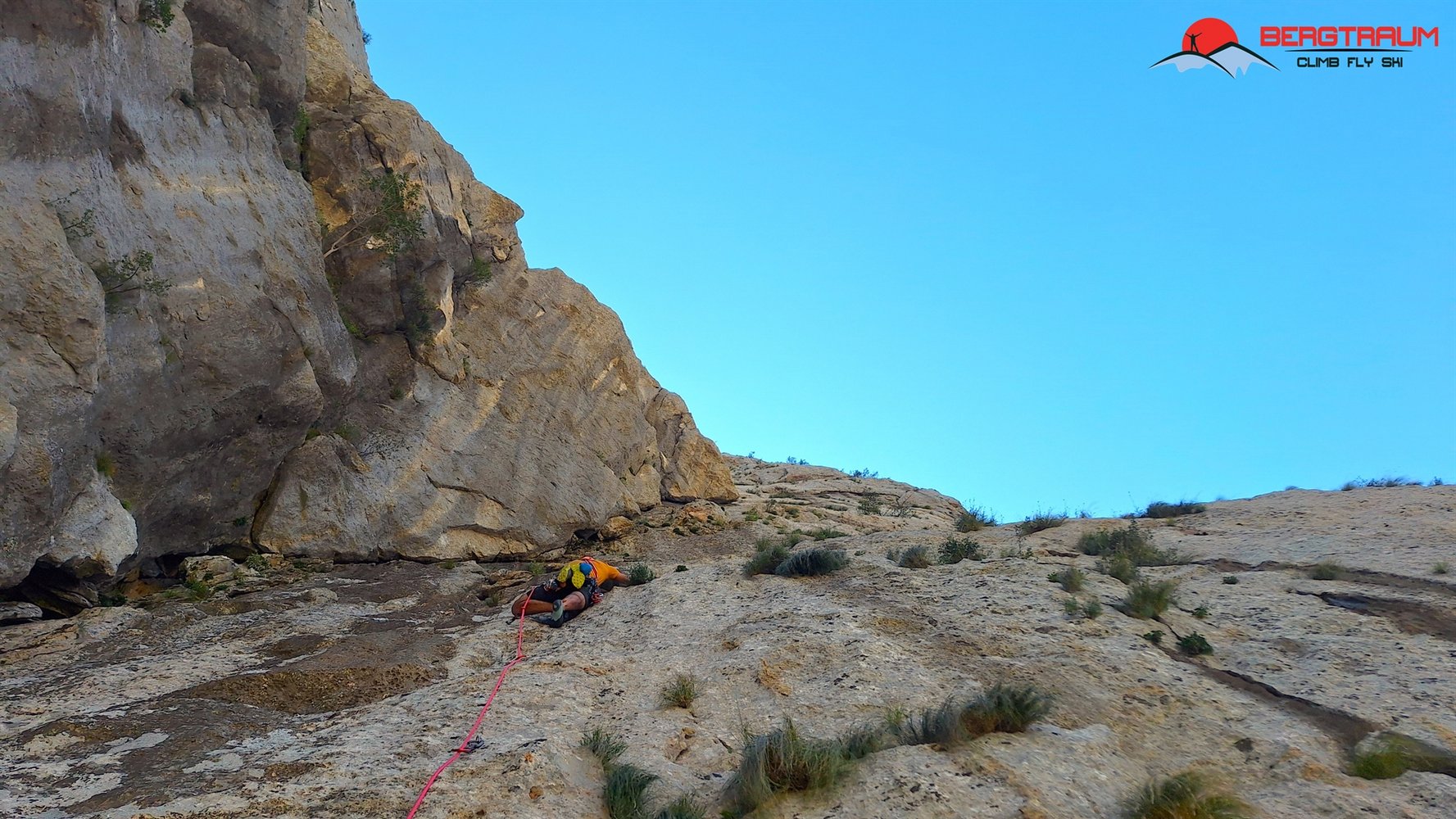 L8- 5c, 25 m: Sehr schöne, steile Verschneidung rauf, dann fast waagrecht linkshaltend sehr ausgesetzt queren zu Stand.
