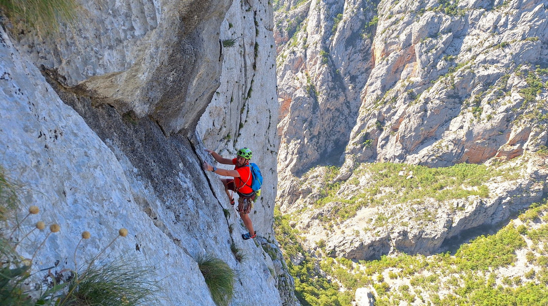 L9- 6a, 30 m: Eine markante Rissverschneidung bis zum Dach hinauf, dann großhenkelig nach rechts queren und plattig senkrecht weiter zum Standplatz.