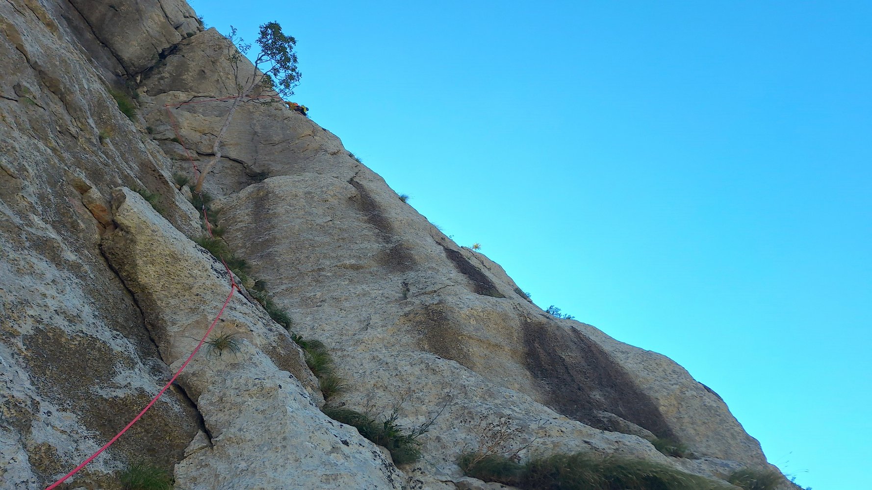 L1- 6a, 45 m: Gerade hinauf und weiter leicht linkshaltend zu Stand.