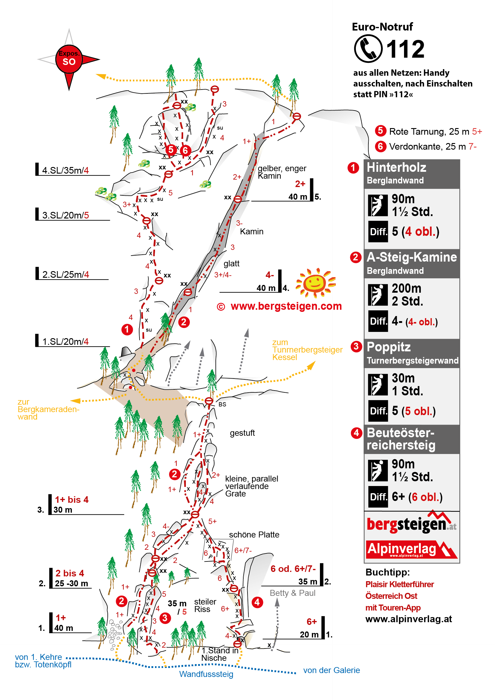 Sehr schöne Kurztour im linken Wandteil der Turnerbergsteigerwand. Eine kurze, kraftraubende erste Seillänge, gefolgt von einer tollen Rampe und Platttenwand hinauf zum Grat. Eine leichte Länge führt zum Fuß des Berglandpfeilers, wo man entweder rechts über Alten Wolf oder Hochemporverschneidung aussteigen kann. Links wartet die Kundfahrt mit vier guten Seillängen.