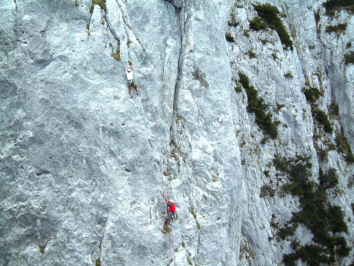 Schöne Route, die oben eine perfekte Platte aufzuweisen hat, in der Mitte gibt es auch noch eine schöne, steile 6+ Seillänge mit guten Griffen. Die Route gehört zu den am meisten gekletterten Routen in diesem Schwierigkeitsgrad an der Steinplatte - absoluter Klassiker!