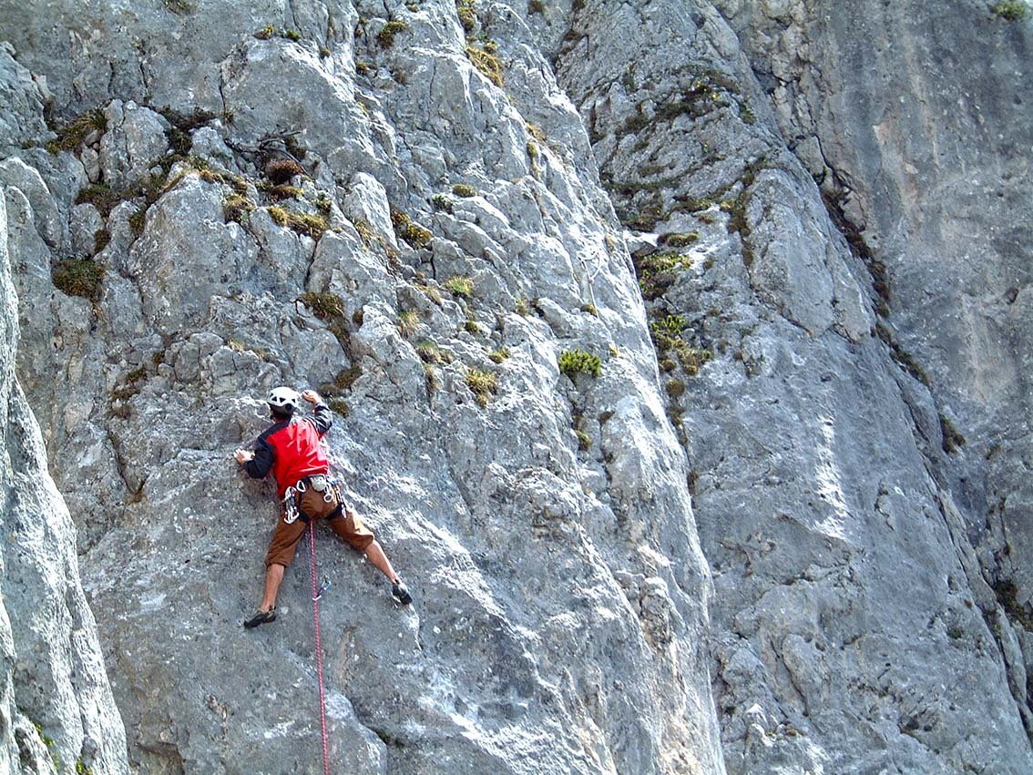Die 3er Länge ist leider etwas brüchig und ohne Sicherung (also etwas vorsichtig klettern, mit 60 m Seil kann man diese Seillänge gleich an die erste Länge anhängen).