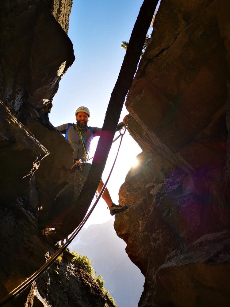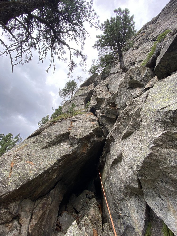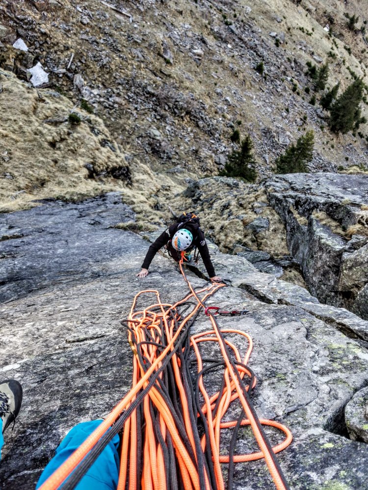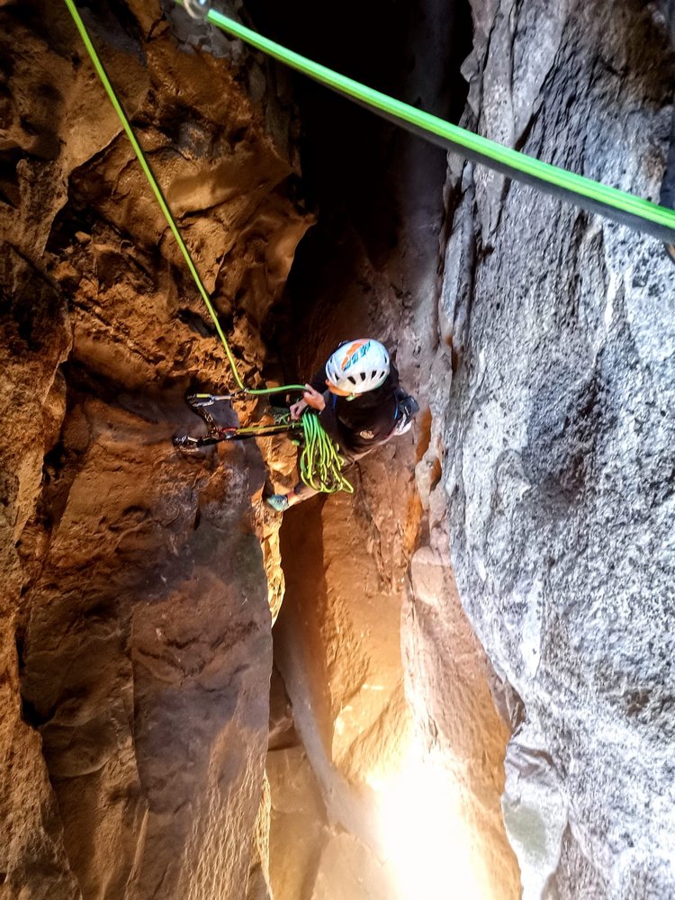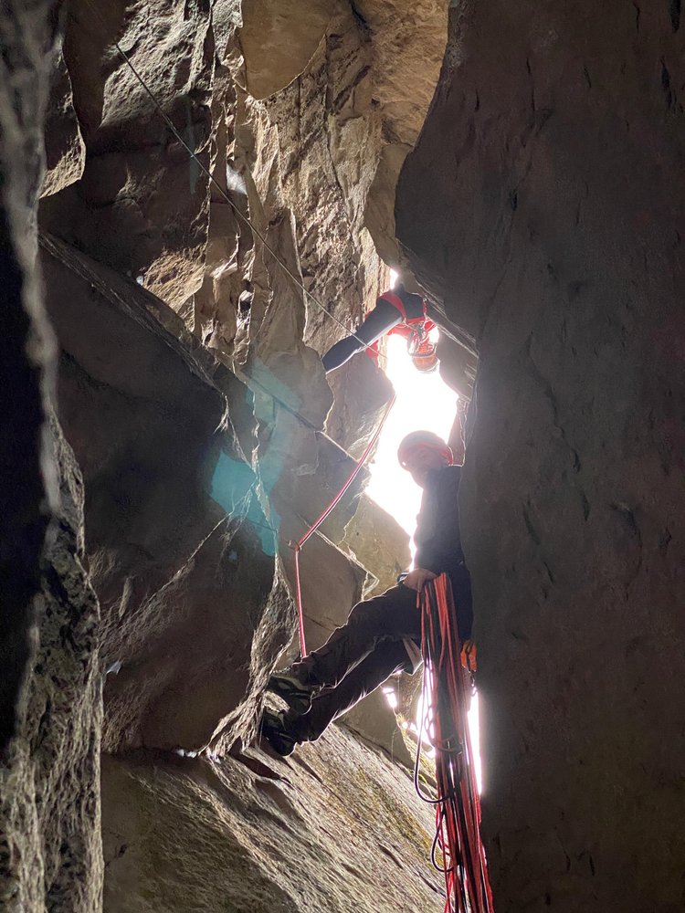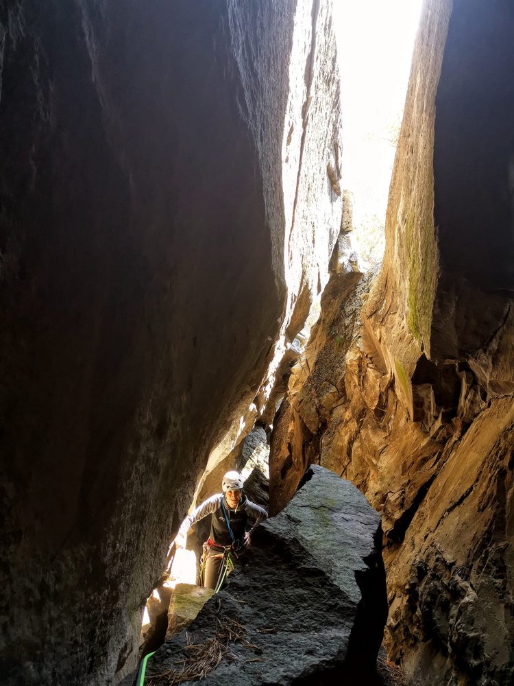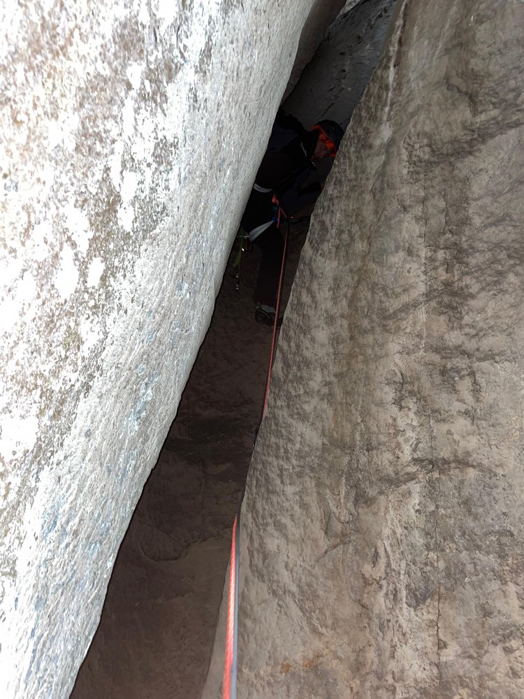 6.SL: Start in den Kamin durch den schmalen Spalt, welcher sich nach innen weitet, dort wird Kamin klettern gefordert. Der sich mittig im Kamin befindliche Stand ist ein pefekter Fotospot, kann bei Bedarf aber auch übersprungen werden.