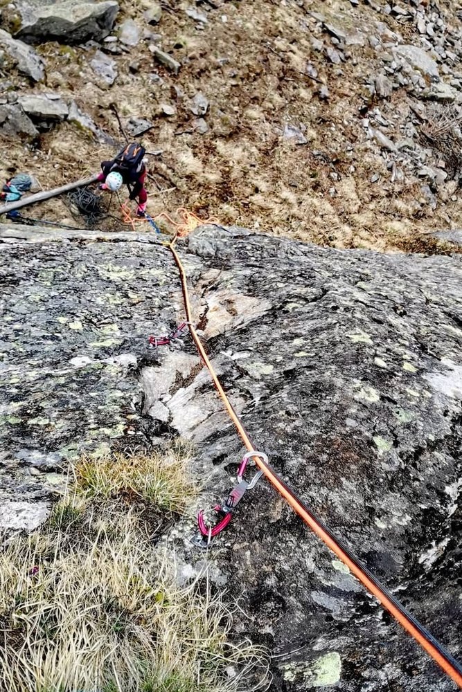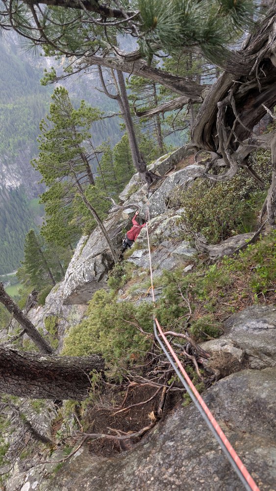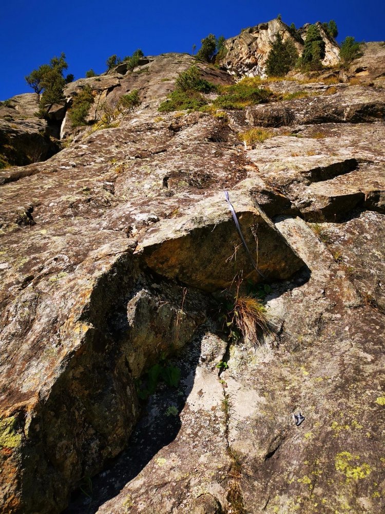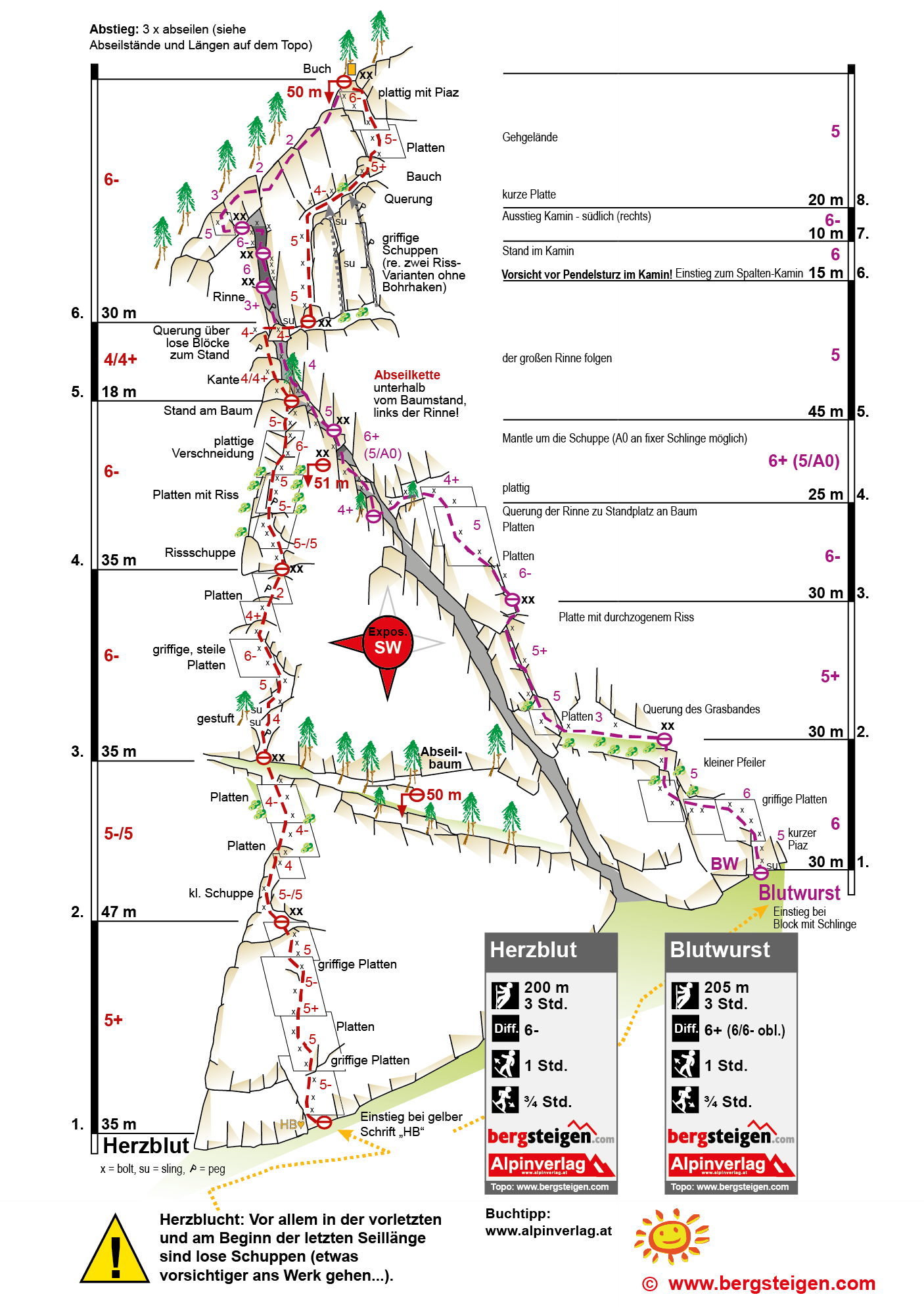 1.SL: Eingestiegen wird ca. 50 m oberhalb der Route "Herzblut", eine Bandschlinge markiert den Start. Nach dem ersten Anstieg links um den kleinen Pfeiler, von dort über den grasigen Felsrücken bis zum Stand.