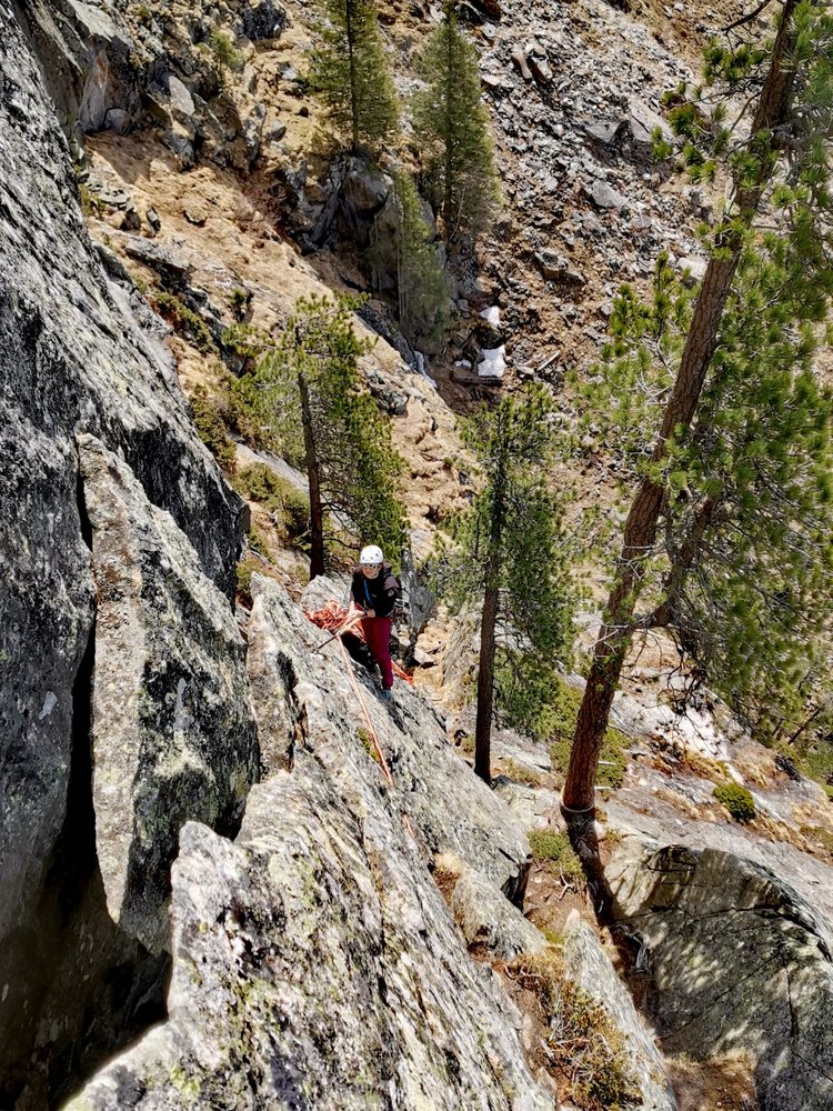4.SL: In der Rinne bleibend über die Plattenblöcke bis zum großen Block, diesen am Spitz überwinden; auf dem Block befindet sich der nächste Standplatz.