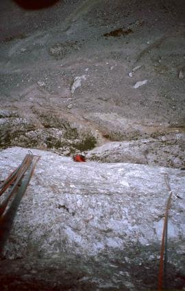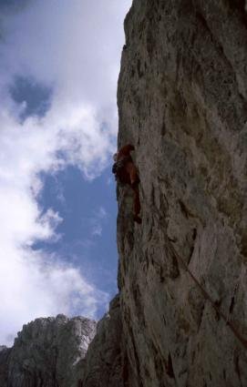 Vom Ausstieg über den Westgrat zum Gipfel und von der Schartenspitze östlich abklettern (1 - 2) in Scharte und nördlich durch eine Schlucht abseilen. Dann über Zustieg zurück.
