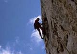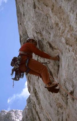 Von unten erstbebohrte Tour. Meist Bolts, an einigen Stellen Rocks (klein bis mittel) und Cams (0,4-2 erforderlich.