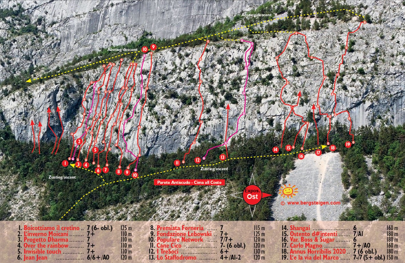 Vom Sportplatz in Dro in Richtung Felswand bis zur querenden Schotterstraße (Radweg), auf dieser nach Norden bis man unter die Felsen der Cima alle Coste kommt. Direkt unterhalb der Felsen (bei einem Stein mit der Aufschrift Antiscudo) auf einem Pfad hinauf zu den Einstiegen (die Route ist im linken Wandteil und angeschrieben).