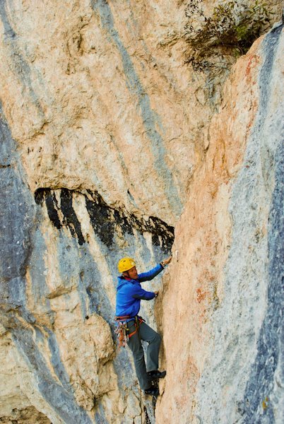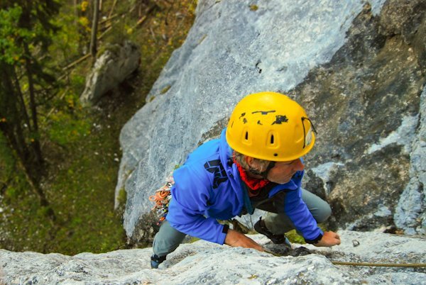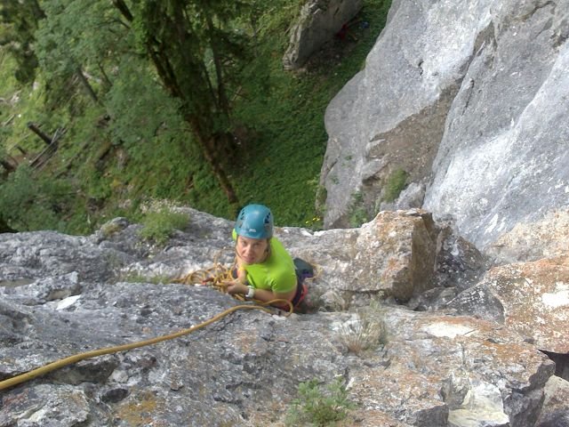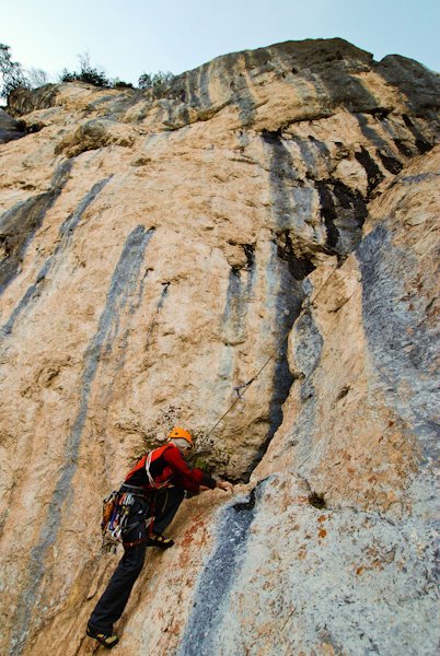 Die ersten drei Seillängen sind plaisirmäßig abgesichert. In der letzten Seillänge sind die Abstände etwas länger.