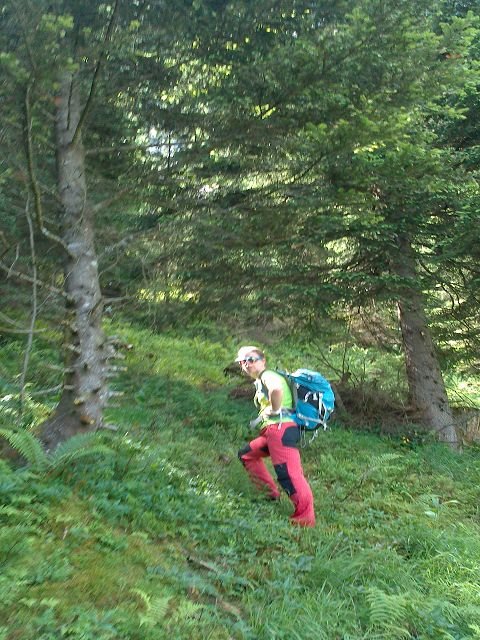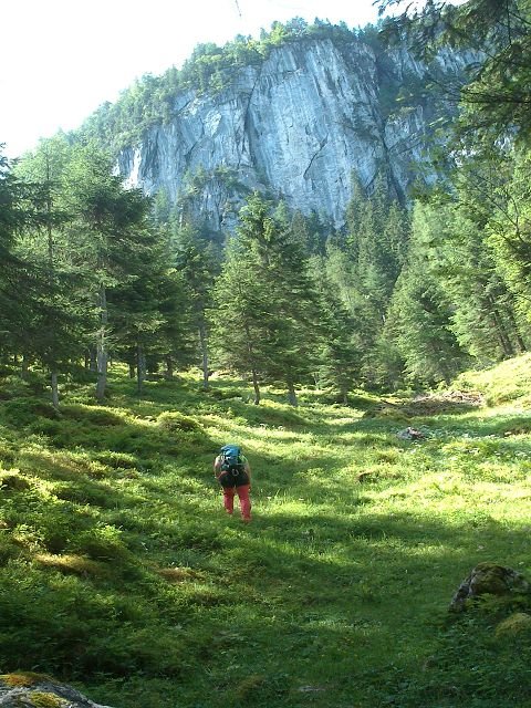 Zwei Möglichkeiten: 1. Entweder direkt beim Abstieg links die "Diagonale" abklettern, I bis II, (bei Nässe nicht ratsam!) Und zurück zum Einstieg. 2. Oder direkt vom Ausstieg in 10 Min. durch den Wald gerade hoch bis zur Scharwandalm Hütte. Von dort den markierten Wanderweg "Steiglweg" zurück zum Gasthaus Gosausee.