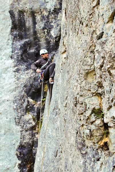 Alpine Plaisirtour. Im unteren Teil steile Risskletterei, die letzten zwei Seillängen klettert man in einer enormen Wasserrille.
