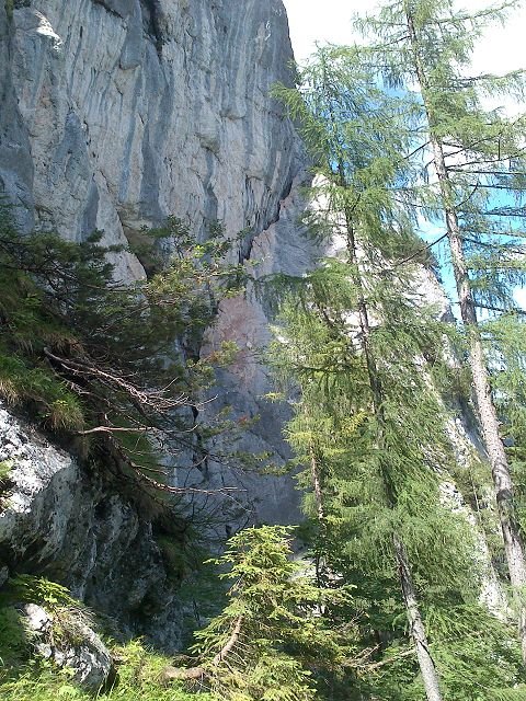 Am Nordwestlichen (rechten) Ufer des Sees entlang bis in der zweiten Bucht ein etwa tischgroßer Boulderblock am rechten Wegrand liegt. Von hier rechts ab und eine steile Wiese ca. 150 Hm hinauf, bis an ihr oberstes Ende. Dort markanter kleiner Baum mit "Stummelästen". Oberhalb, parallel zur Wand entlang in südlicher Richtung, bis der Rand eines großen "Schlages" (durch eine Lawine verursachte, baumfreie Zone!) erreicht wird. Hier befindet sich der Einstieg gegenüber eines kleinen Türmchens. Rechts neben dieser Route beginnt die Route "Mauerläufer" (7a).
