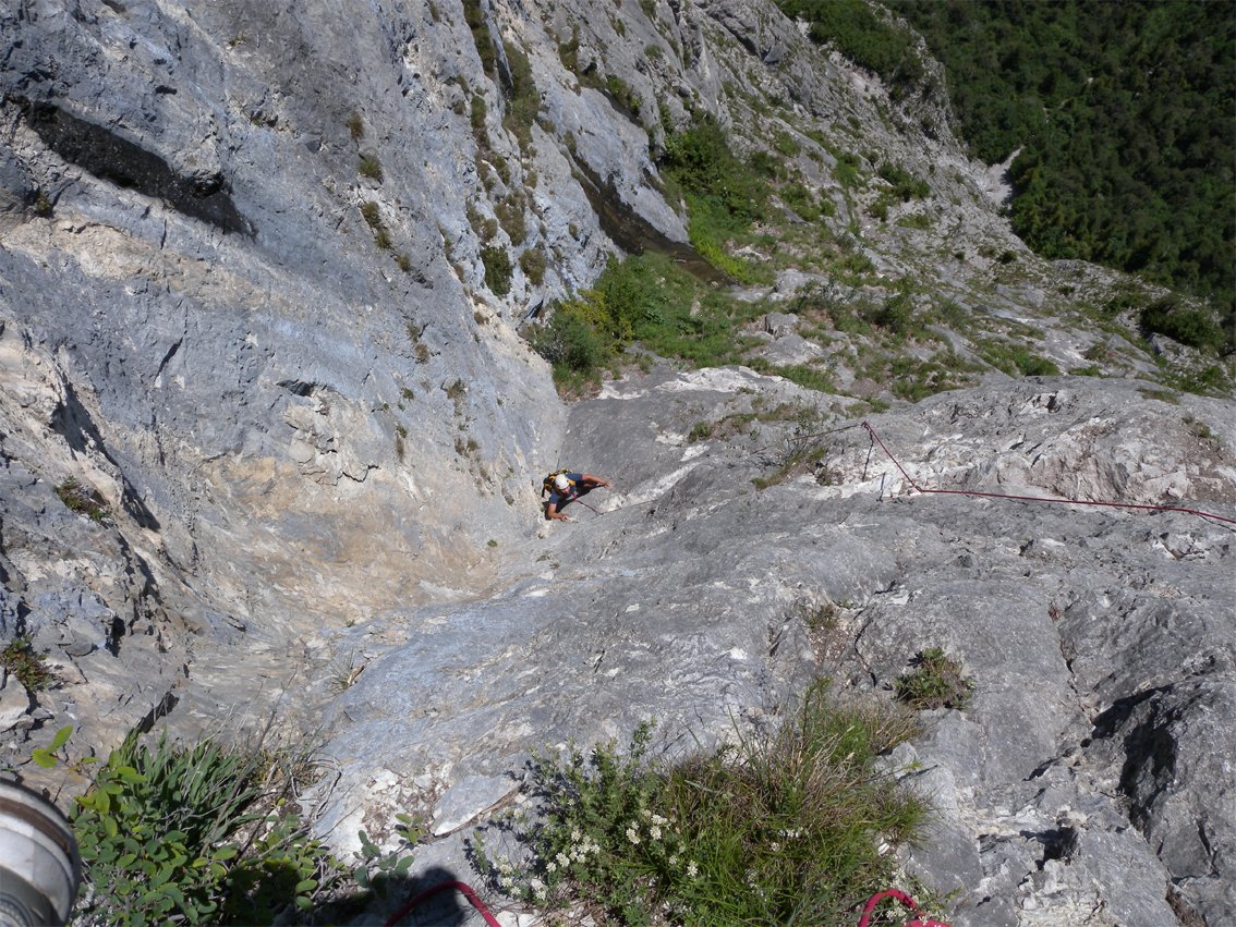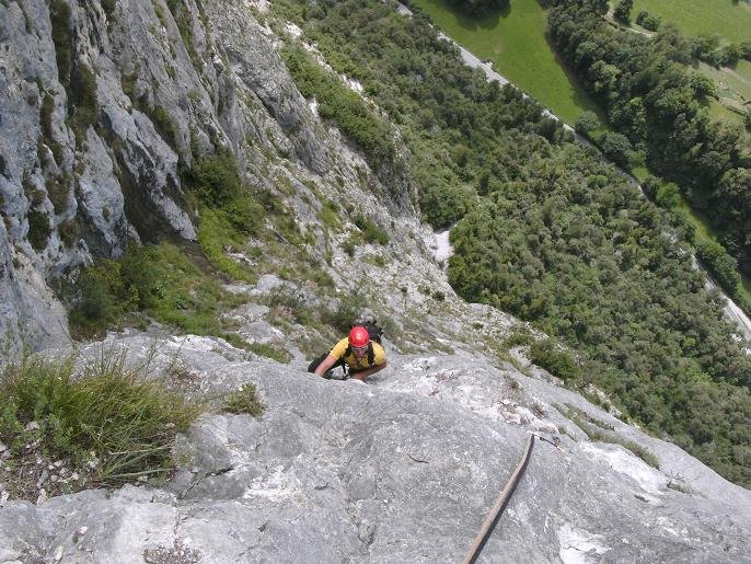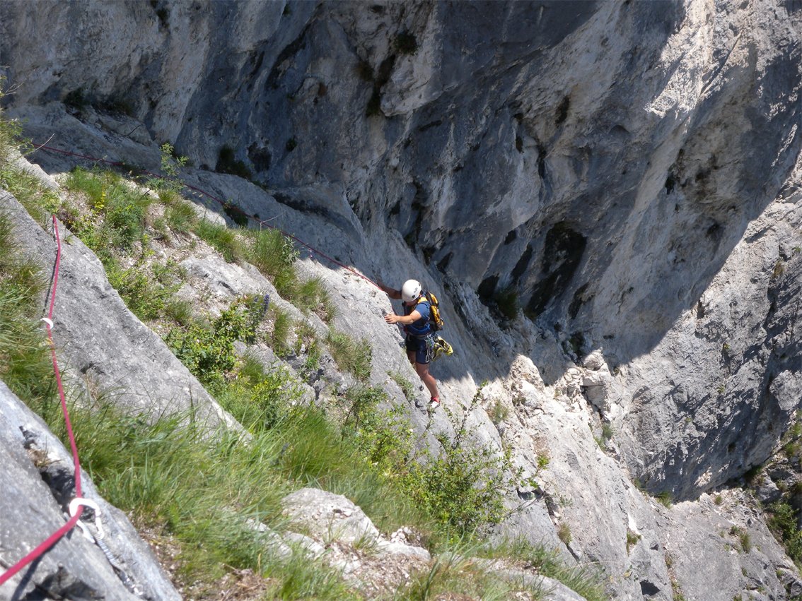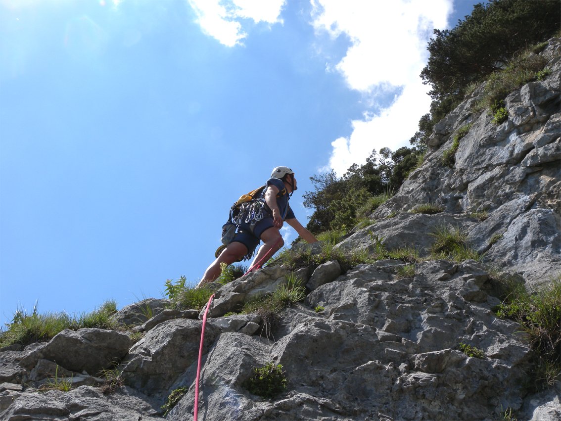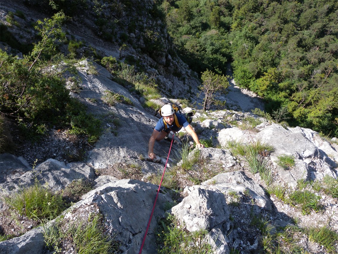 Die Tour ist an den schweren Stellen sehr gut mit Bohrhaken abgesichert, im grasigen, brüchigen 2er Gelände aber auch weitere Abstände.