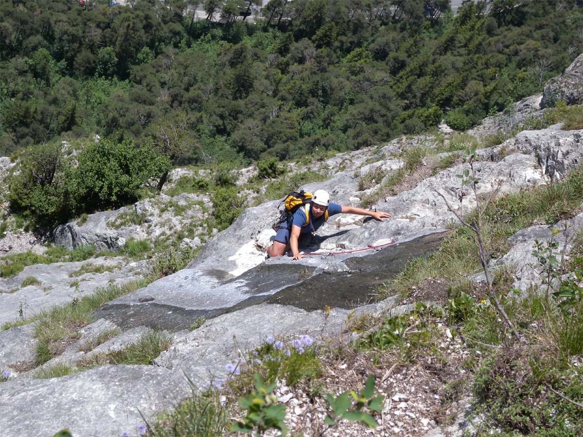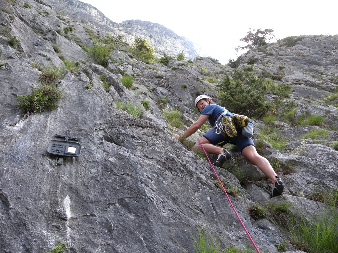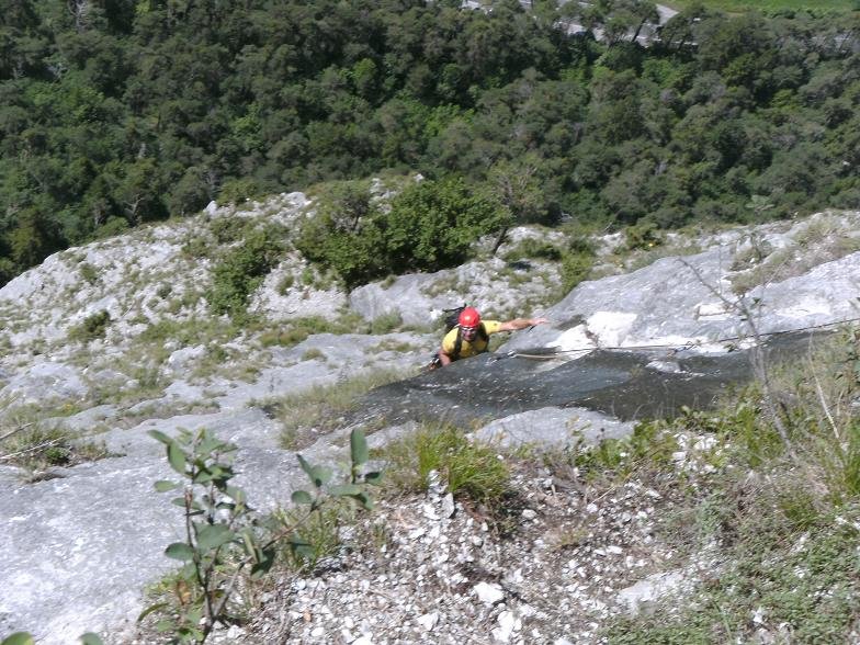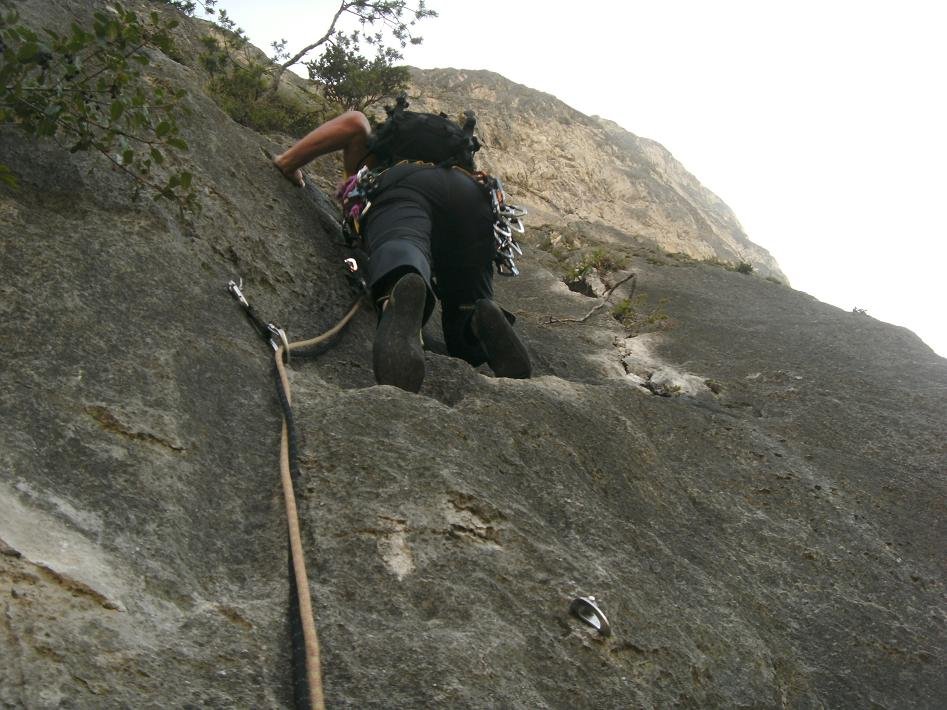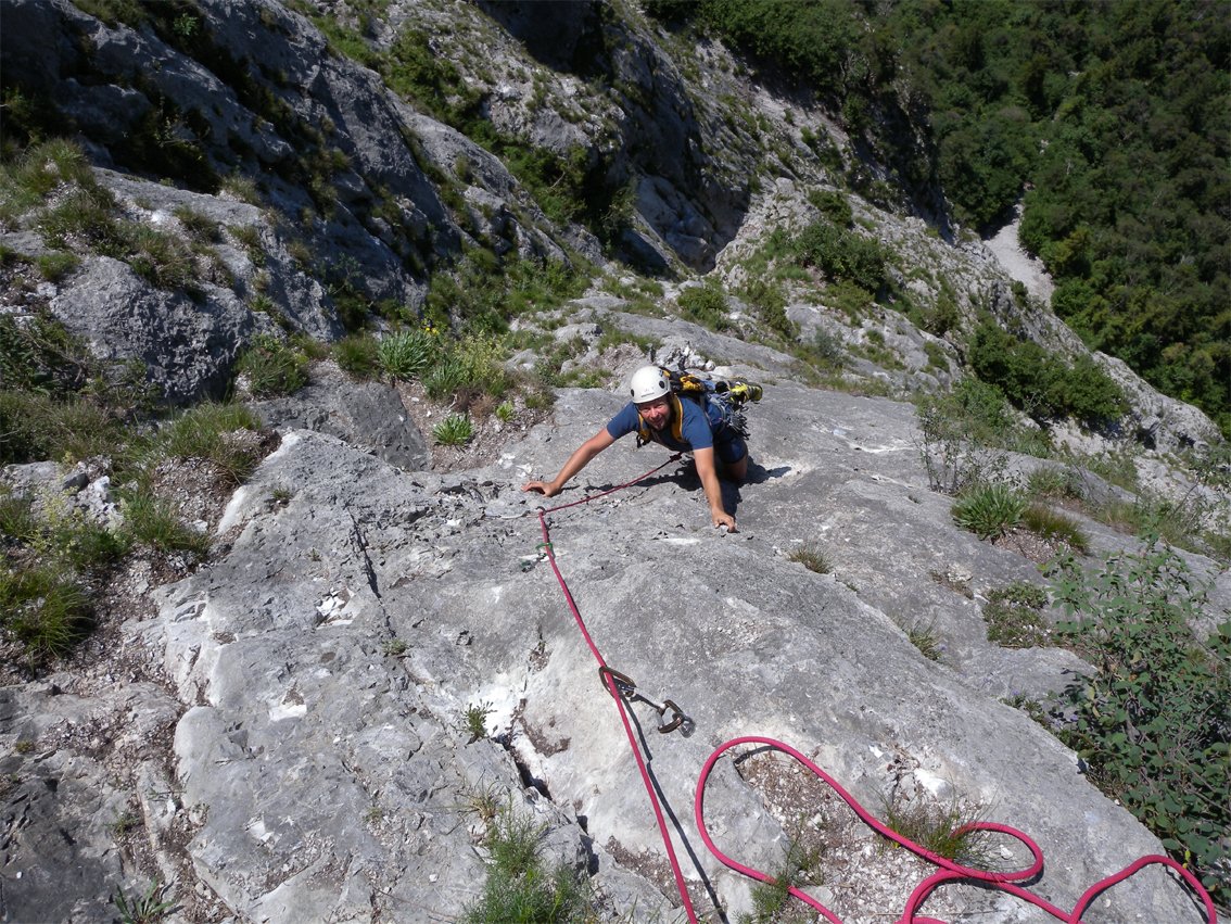 Die Tour ist an den schweren Stellen sehr gut mit Bohrhaken abgesichert, im grasigen, brüchigen 2er Gelände aber auch weitere Abstände.
