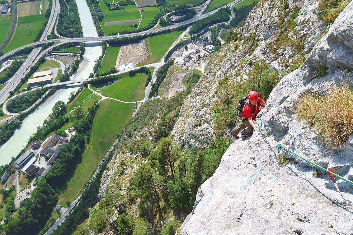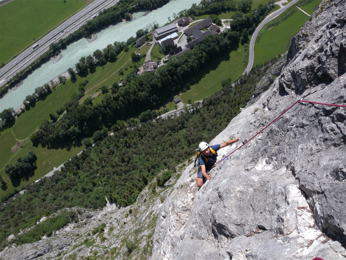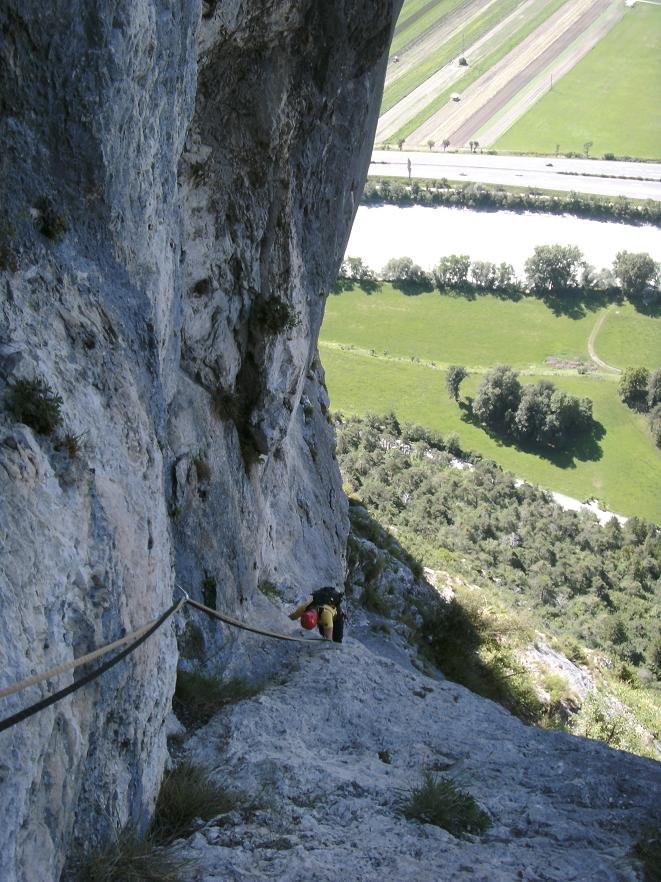 Sehr gut abgesicherte Plaisirroute im westlichen Teil der Martinswand. 19 Bohrhaken pro Seillänge, senkrechte Graspassagen, die es zu überwinden gilt - größer könnte der Kontrast nicht sein. Wer Wert auf gepflegtes Klettern an festem Fels legt, ist in dieser Tour fehl am Platz - richtig sind Abenteurer mit aktivem Zeckenschutz. Spaß bei Seite - es gibt nur wenige schöne Seillängen und die findet man eher im oberen Wandteil. Eine gewaltige Tour, die mit etwas Humor leichter zu bewältigen ist, auch gewöhnt man sich irgendwann an die Grasbüschel.