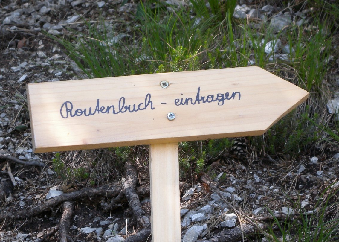 Vom Parkplatz bis zum Einstieg des Klettersteiges. Dort nach rechts der Wand entlang - zuerst auf-, dann kurz absteigen - bis in eine Schutthalde. Dort befindet sich ein altes kleines Eisenkreuz (Josef Klotz) an der Wand. Unmittelbar rechts davon (roter Pfeil; Tafel) geht es zur Sache.