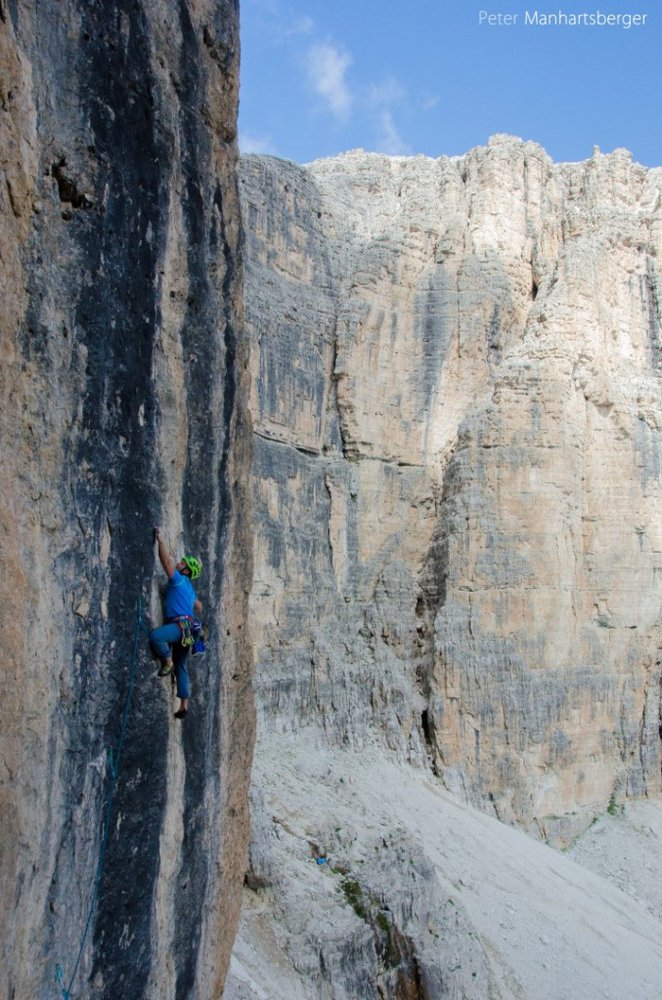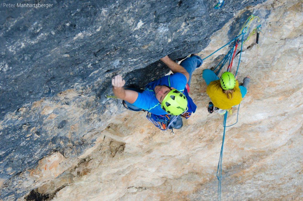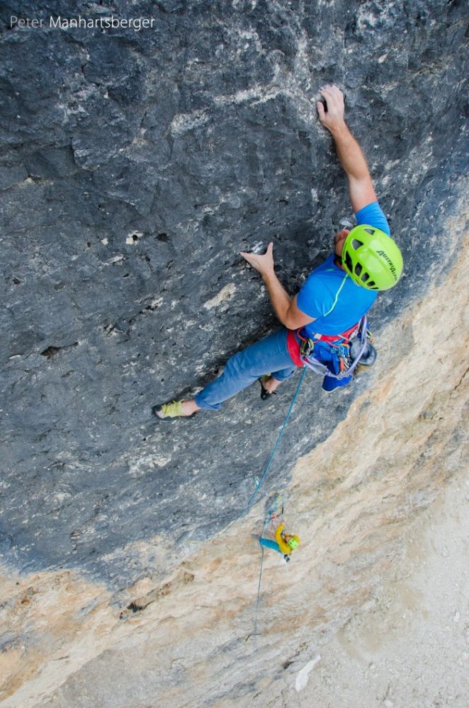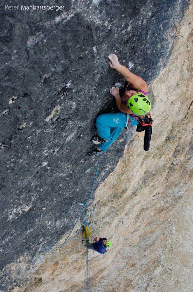 Mit 10 mm Austrialpin Edelstahlbohrhaken eingebohrt. Nur Expressschlingen notwendig.