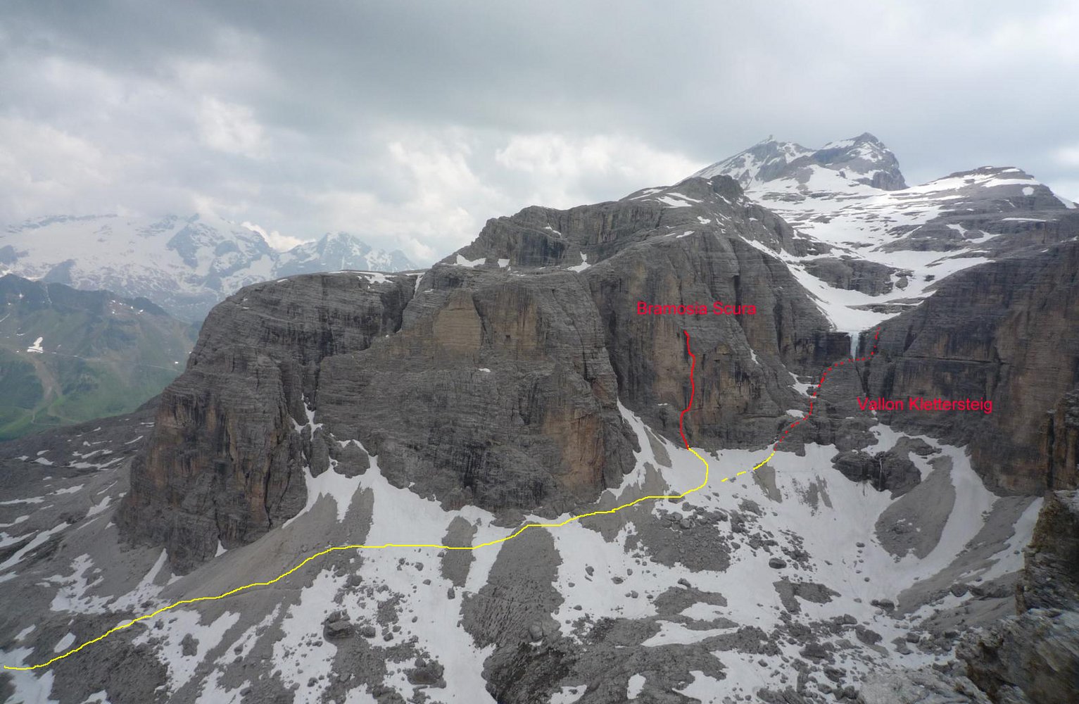 a) Von Corvara mit Seilbahn und Sessellift bis ins Vallonkar (2500m). Sommerbetriebszeiten 8:30 bis 17:30 Uhr. Von hier in ca. 30 Min auf markiertem Steiglein ins hintere, schattige Vallonkar zum Einstieg.