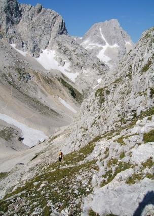 Vom Gipfel nordwärts den Steinmännern in teilweise leichter Kletterei fogend über schuttbedeckte Bänder und Felstufen bis unter den Brotfall-Nordgipfel. Weiter unschwierig in die Brotfallscharte, wo man auf den markierten und z.T. gesichteren (A/B) Priel-Normalweg trifft. Auf diesem hinunter zum Prielschutzhaus und weiter nach Hinterstoder.