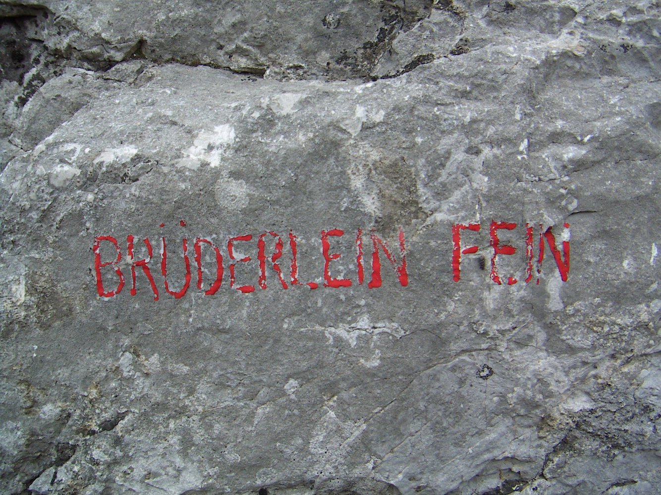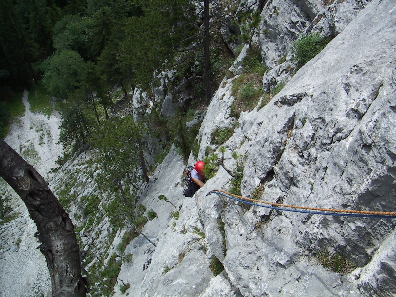 Entweder abseilen oder Steigspuren nach rechts folgen (ca. 10 min bis "Gassl") und über das "Gassl" (grosse Schuttrinne, die die Vordere Stadlwand von der eigentlichen Stadlwand trennt) absteigen (Markierung)!